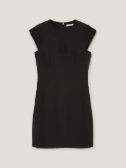 Abito a bustier in tessuto tecnico stretch; scollo tondo stretto, motivi frontali di tagli shaping, maniche corte ad aletta; chiusura nel centro dietro con zip invisibile.