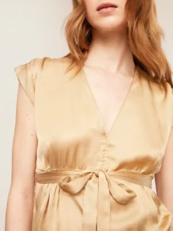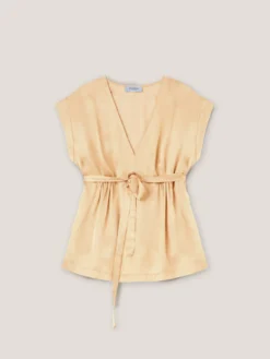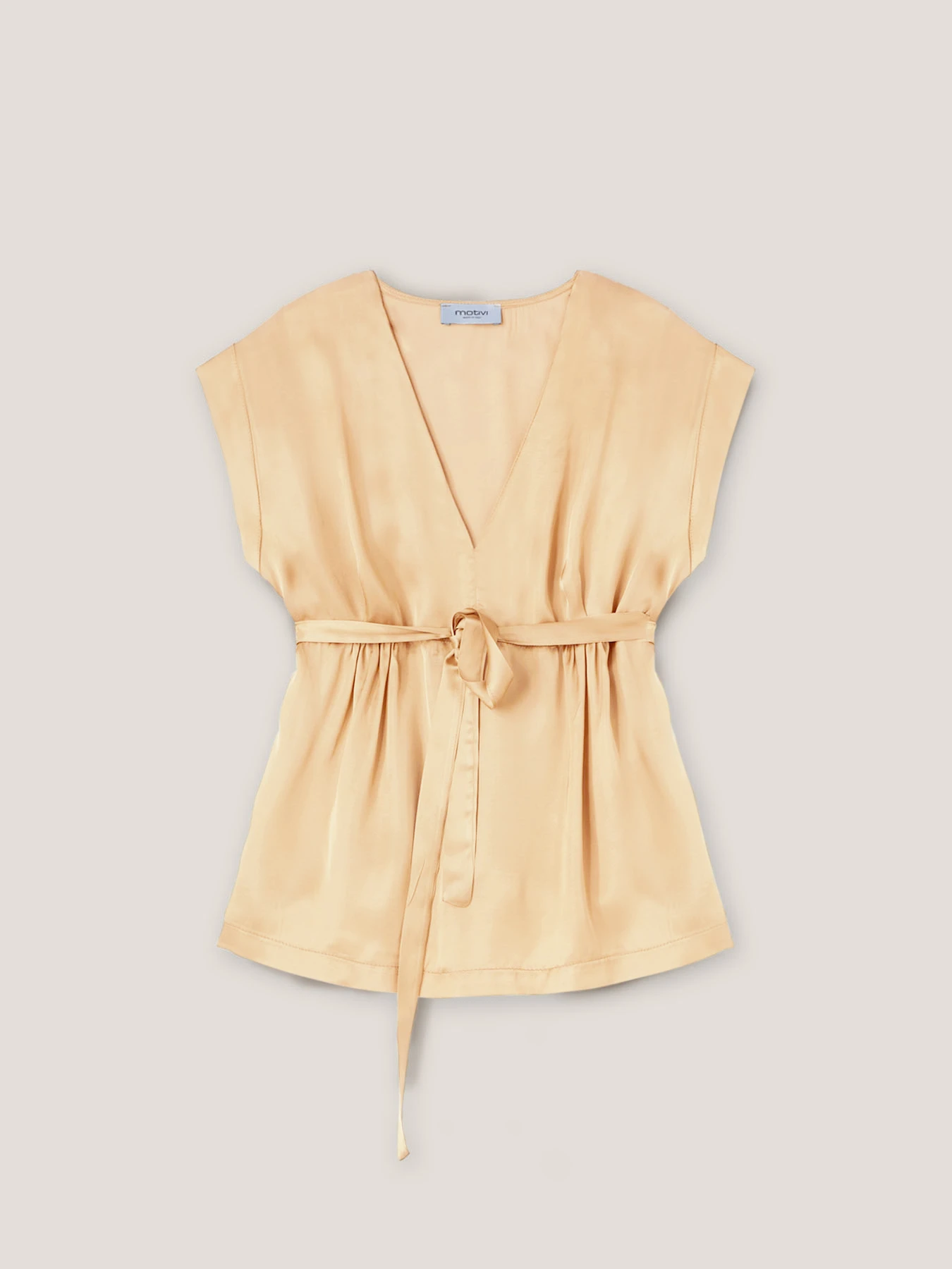 Blusa in raso di viscosa tinta unita; modello a kimono con scollo a v e maniche corte ad aletta; fusciacca in vita tono su tono.
