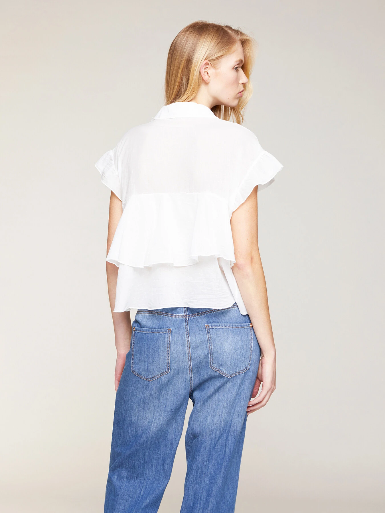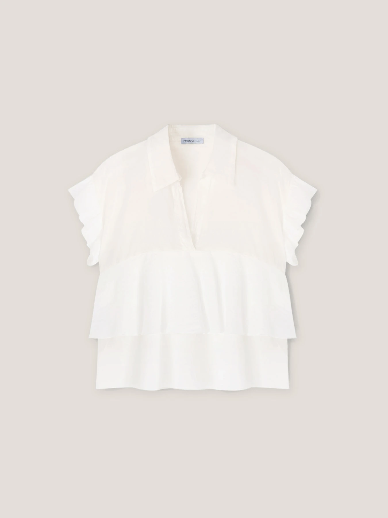 Blusa con balze in voile di cotone tinta unita; scollatura a v frontale con colletto a vela; maniche corte a rouches.