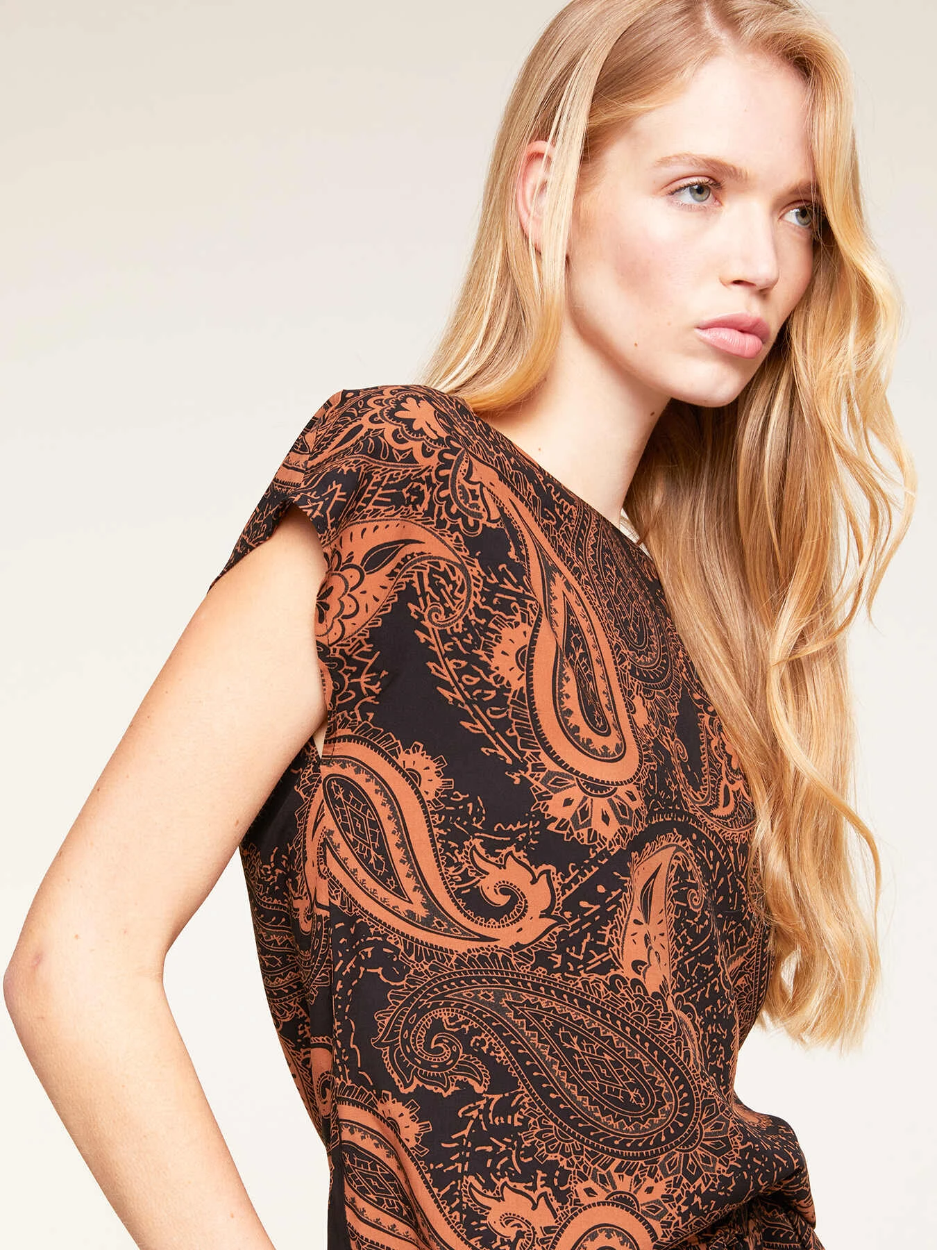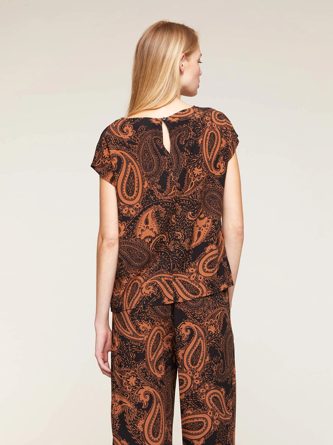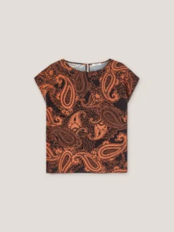Blusa fluida 100% viscosa fantasia cashmere; modello a kimono con scollo a barca e motivo a goccia posteriore; maniche corte.