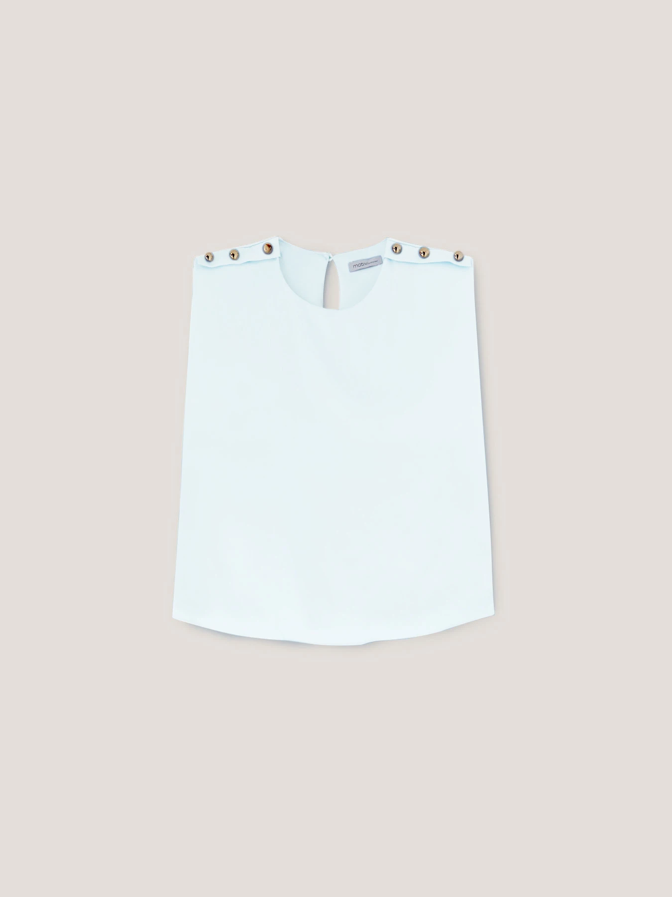 Blusa in raso tinta unita; modello senza maniche con spalla larga imbottita e motivo bottoni; scollo tondo e apertura a goccia nel centro dietro.