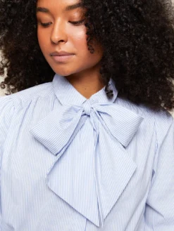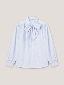 Camicia in tessuto tinto filo fantasia a righe; colletto classico con fiocco e abbottonatura all’inglese; maniche lunghe con leggero sbuffo ad attaccatura.