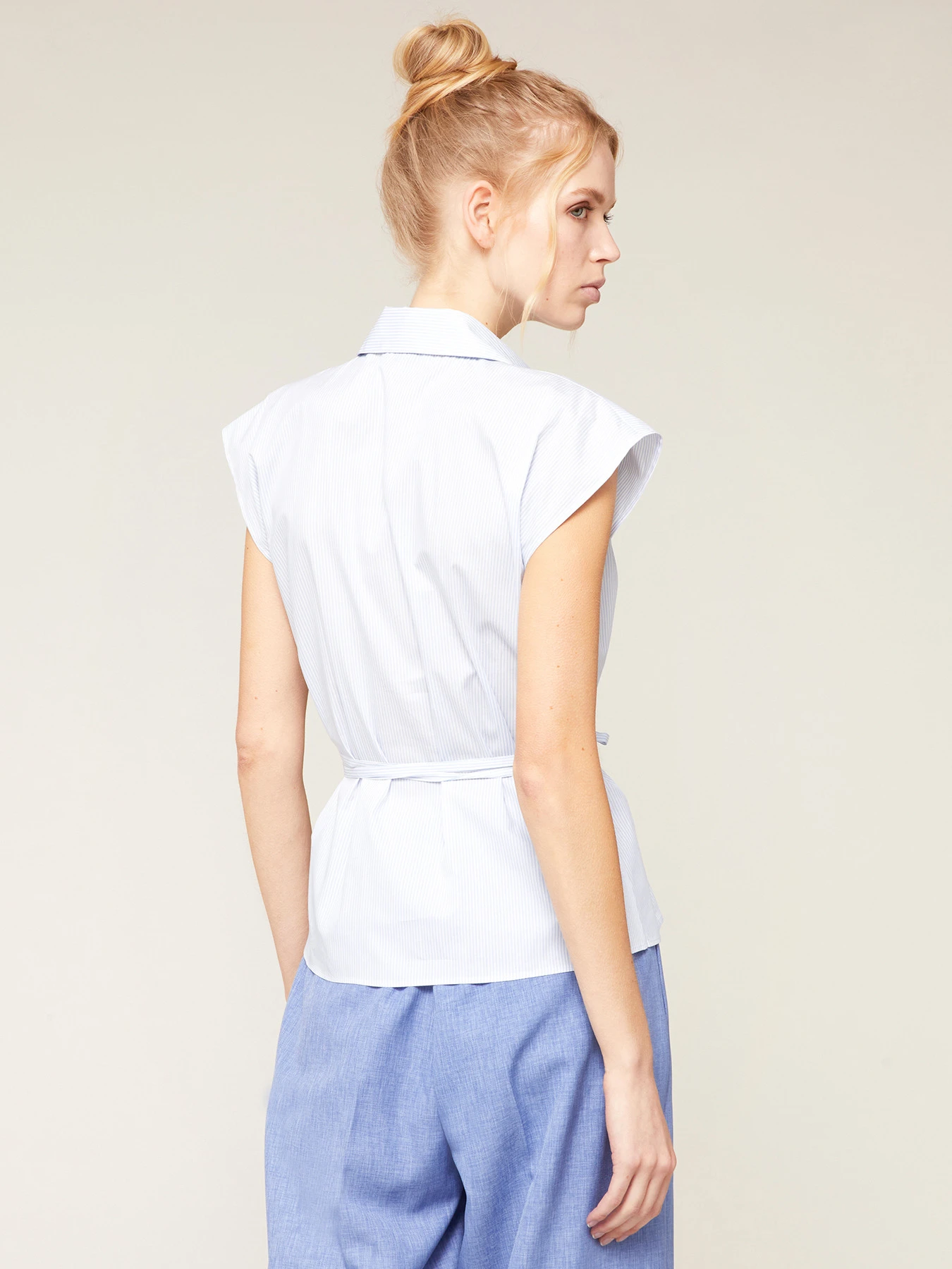Camicia in popeline di cotone fantasia a righe; apertura frontale con colletto a vela e abbottonatura all’inglese; maniche corte ad aletta, nastro tono su tono da annodare in vita.