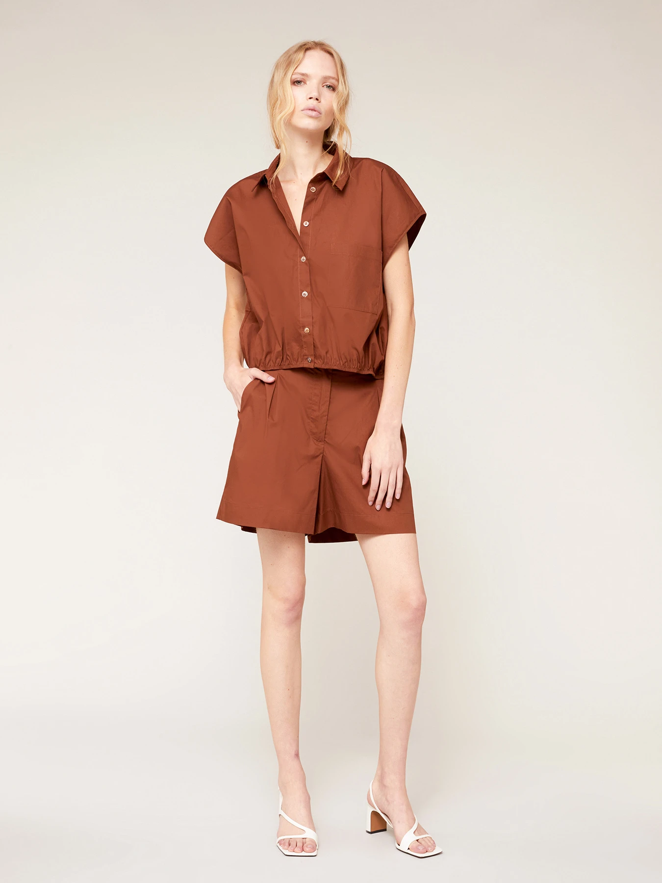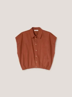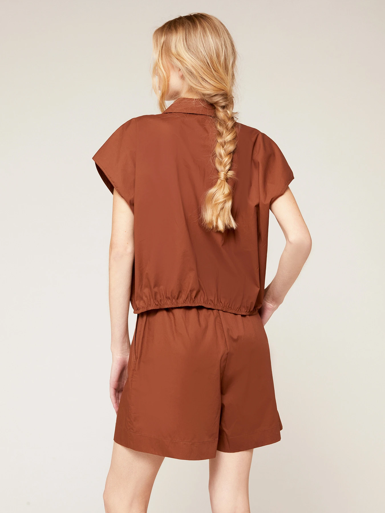 Camicia corta in popeline di cotone tinta unita; modello a kimono con apertura frontale con colletto a vela e bottoni a vista effetto madreperla; maniche corte, tasca anteriore applicata, elastico inserito al fondo.