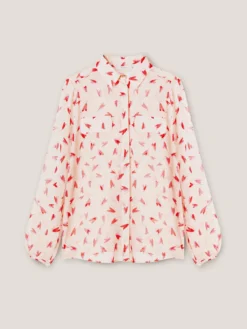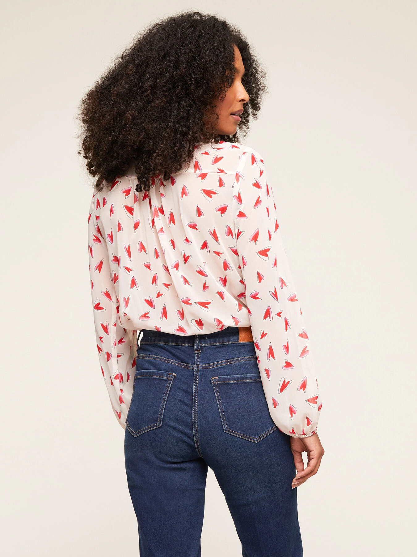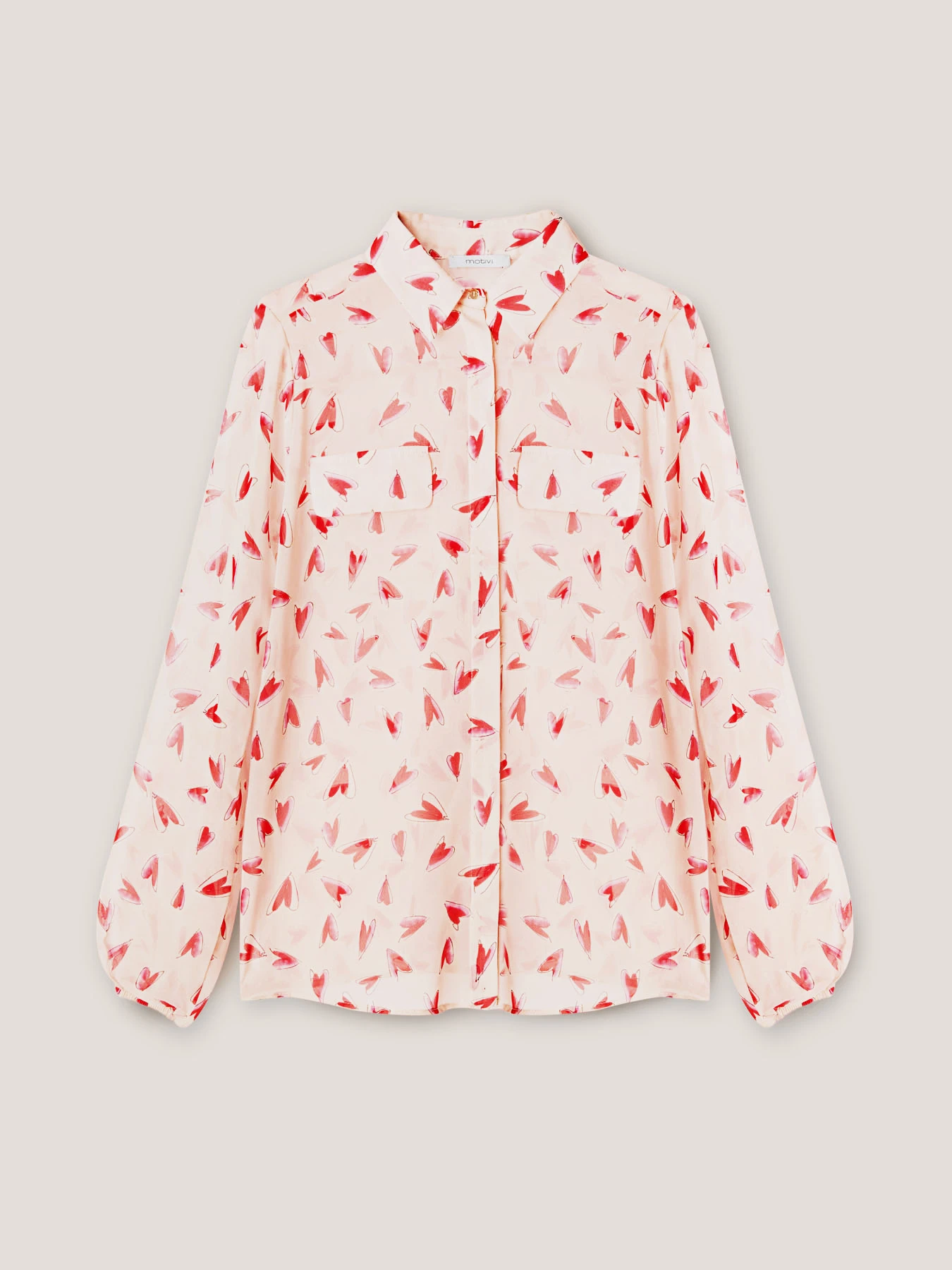 Camicia in georgette fantasia cuori; colletto a vela e abbottonatura all’inglese con primo bottone a vista; maniche lunghe con elastico sul fondo; tasche finte a patta anteriori.