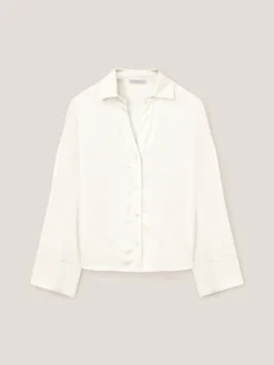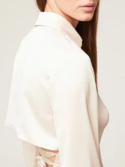 Camicia in raso tinta unita; scollo frontale a v con colletto a vela e bottoni a vista; maniche lunghe ampie con alto bordo al fondo, motivo cut-out posteriore con intreccio.
