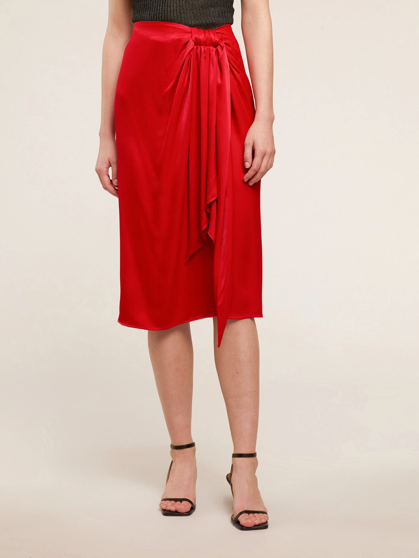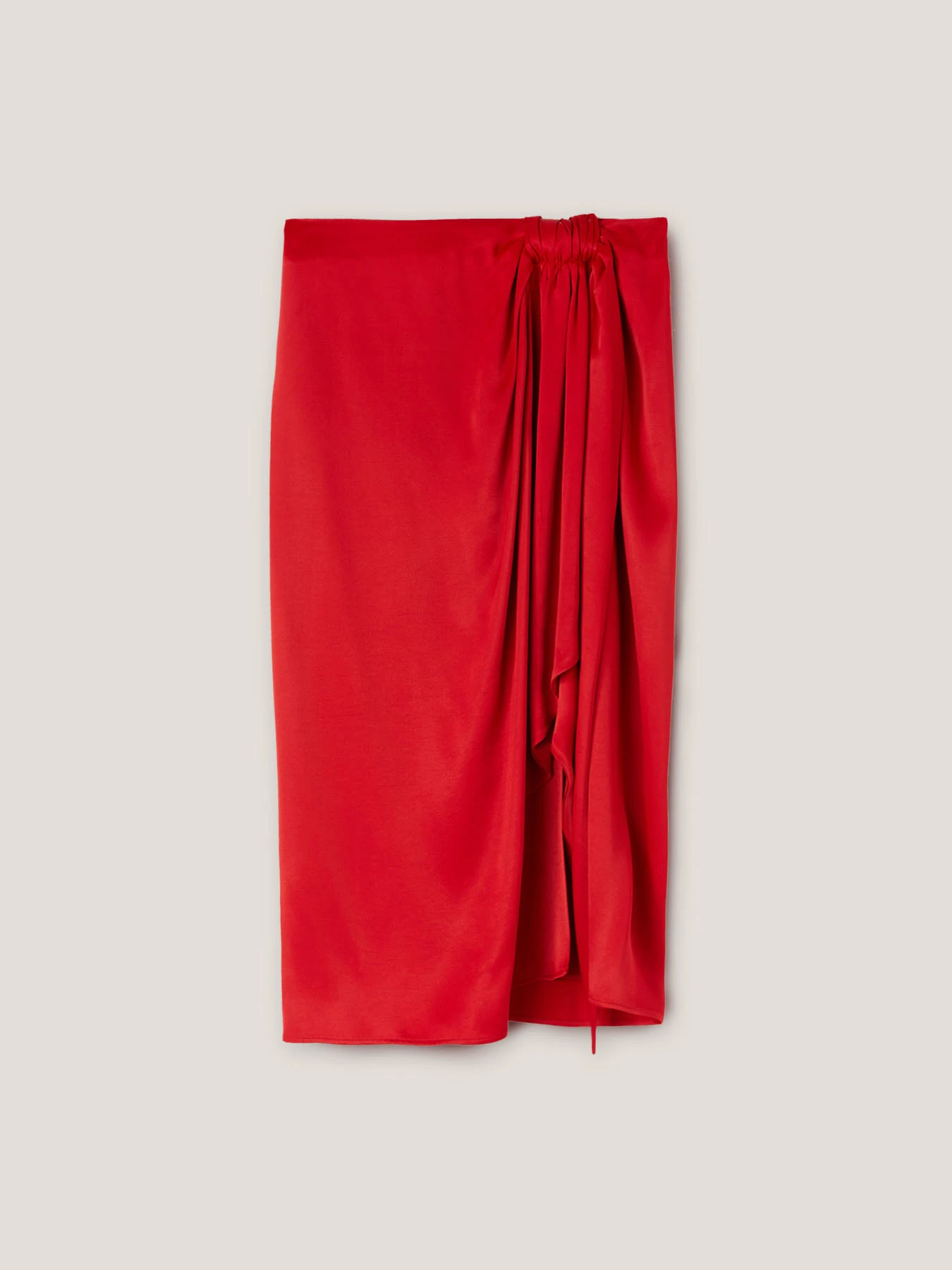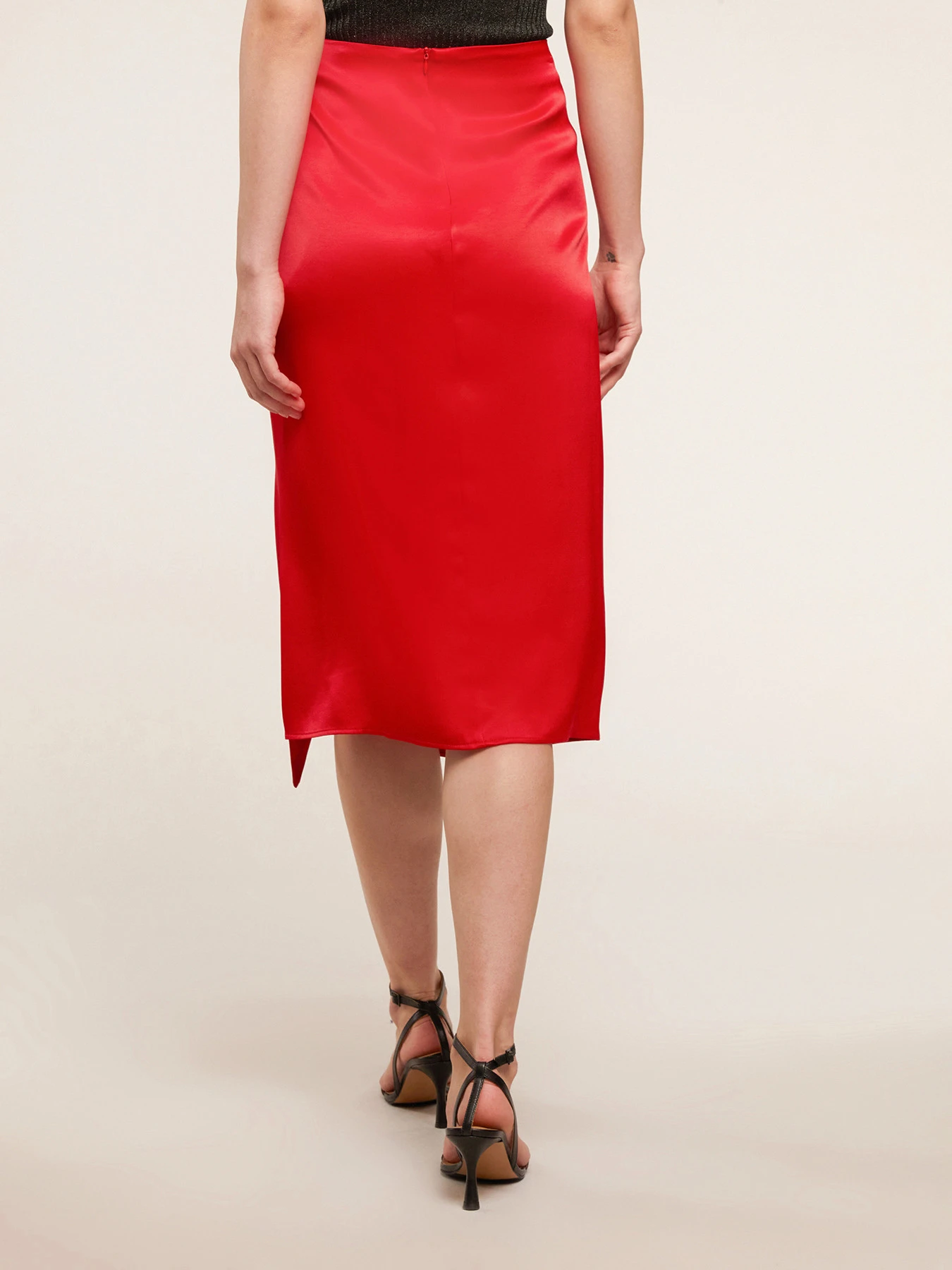 Gonna elegante in raso di viscosa tinta unita; lunghezza midi, motivo torchon frontale; chiusura con zip invisibile nel centro dietro.