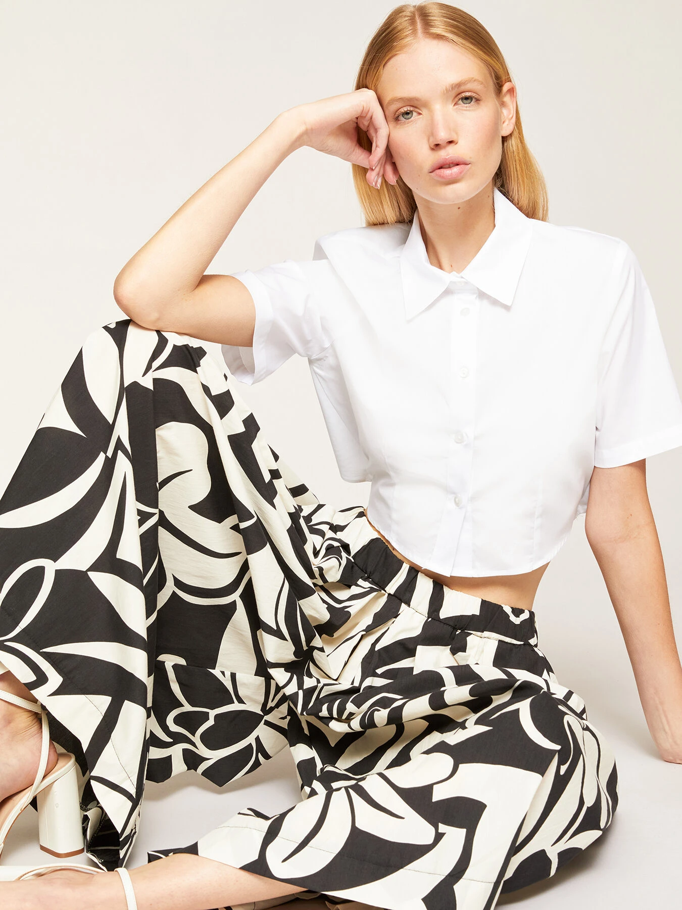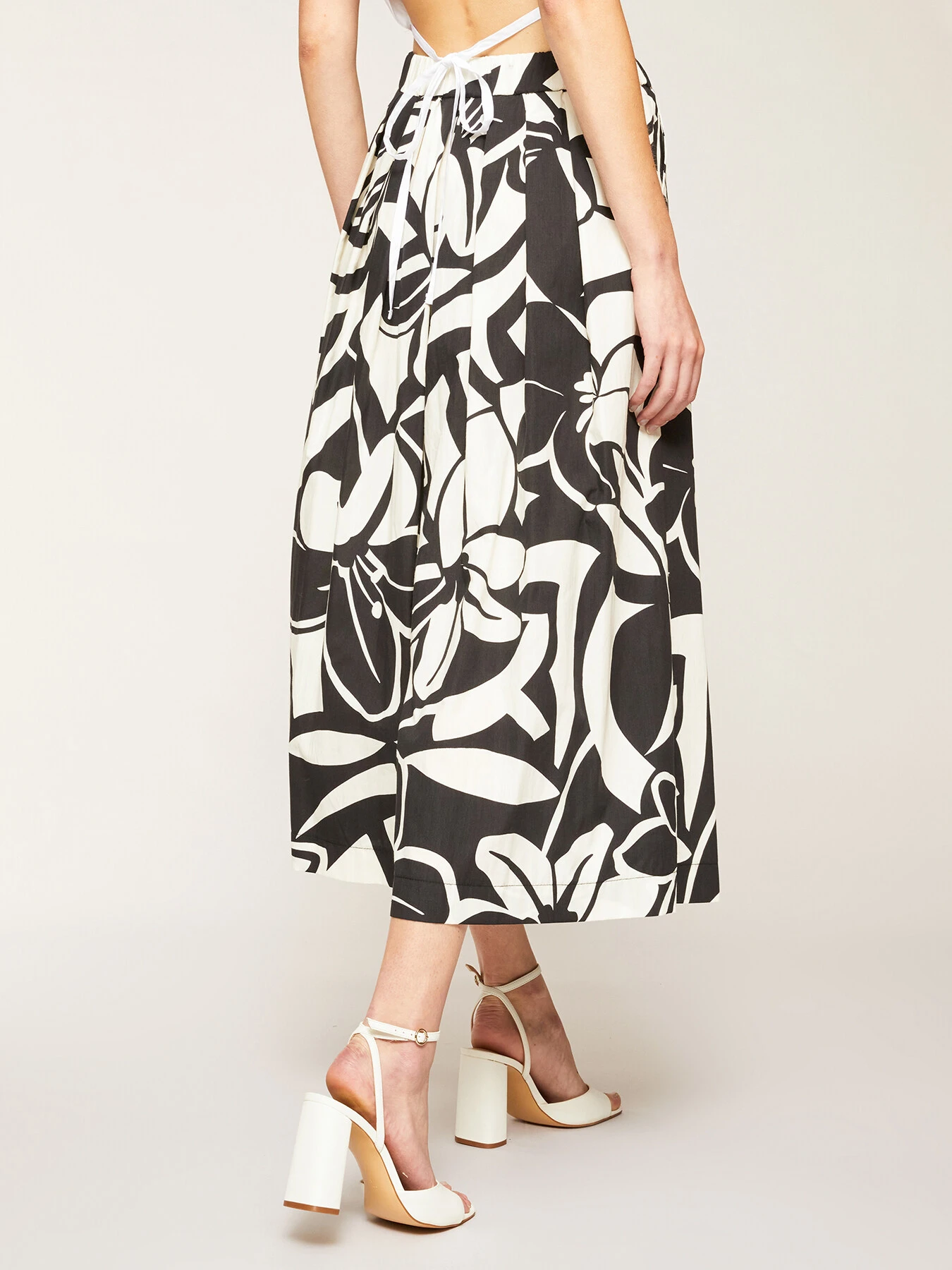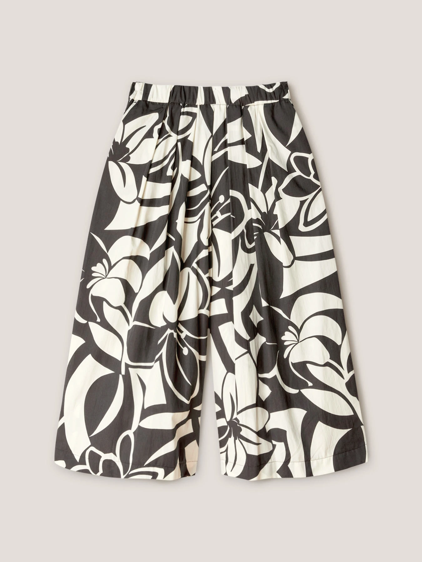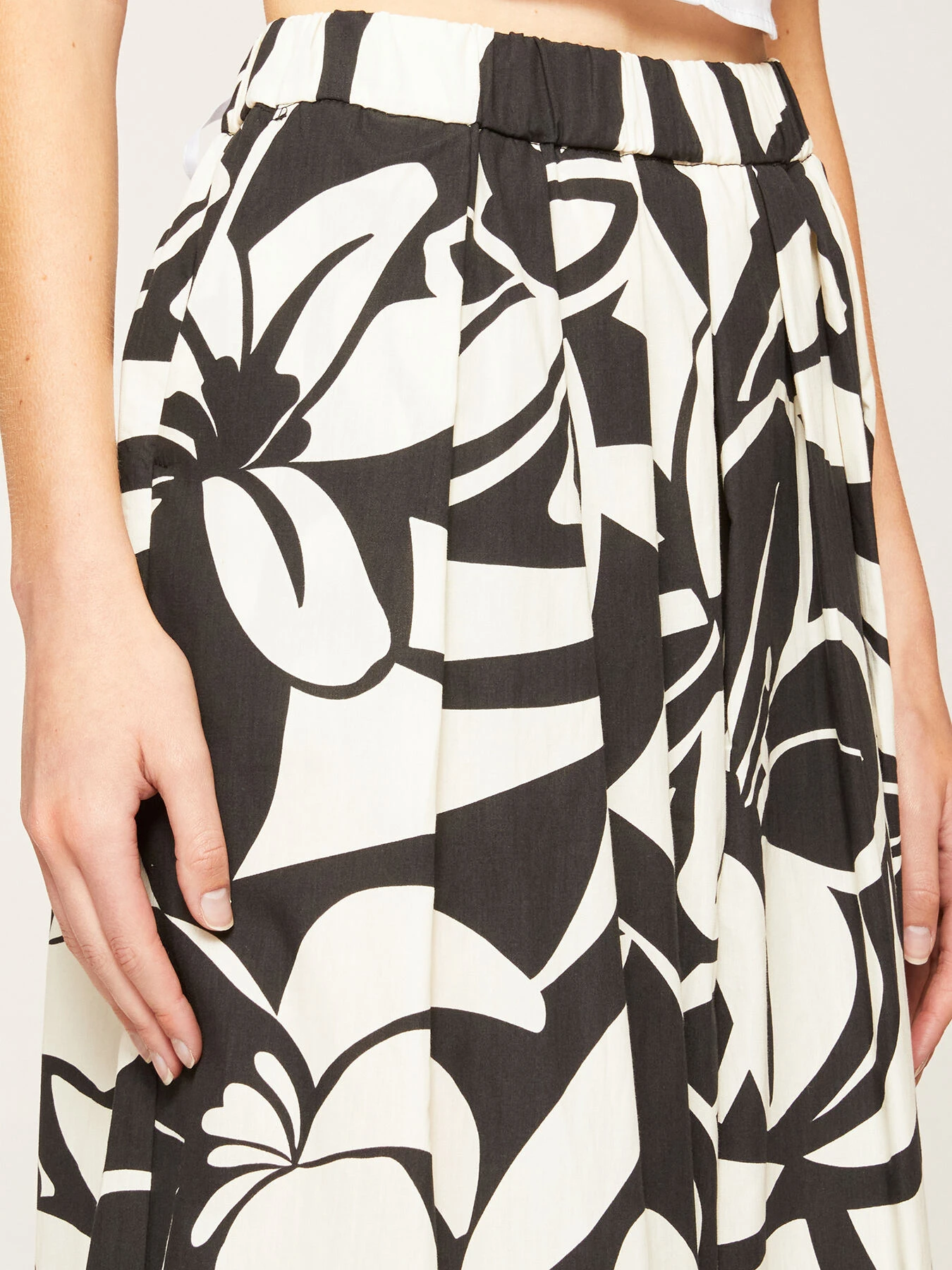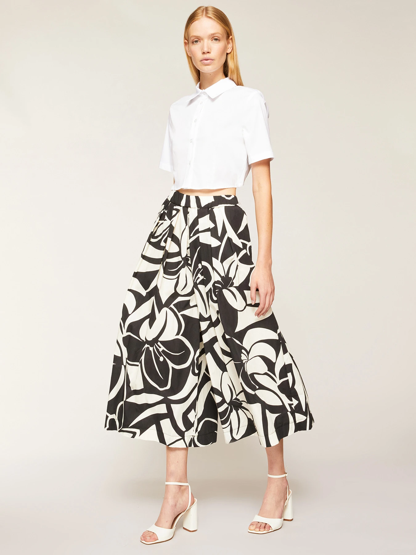 Gonna pantalone in mussola di cotone fantasia floreale; vita stretch con elastico interno; tasche all’americana inserite nel fianco, linea svasata.