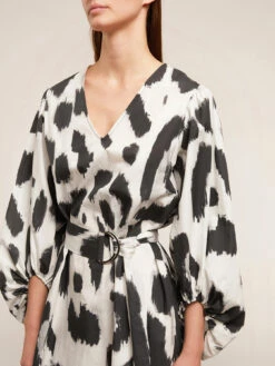 Maxi vestito estivo lunghezza midi fantasia maculata in cotone; scollo a v frontale, maniche ampie a tre quarti; cintura in vita tono su tono con fibbia metallica.; Scegliendo i nostri prodotti in cotone state supportando il nostro contributo alla missione di Better Cotton promuovendo una produzione più responsabile del cotone. Questo prodotto proviene da un sistema di bilancio di massa e pertanto potrebbe non contenere Better Cotton.
