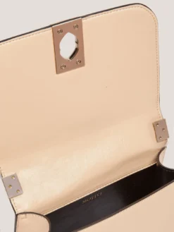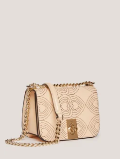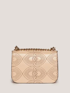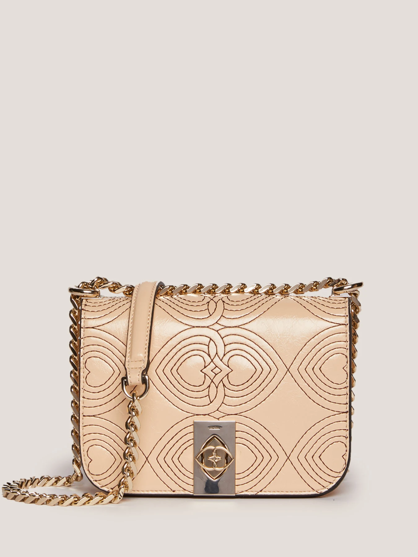 Mini City Bag in similpelle lucida con ricamo; tracolla regolabile in catena metal diamantata, chiusura con nottolino Double Love, tasca interna; dimensioni: altezza 14 cm, larghezza 19 cm, ampiezza 7 cm.