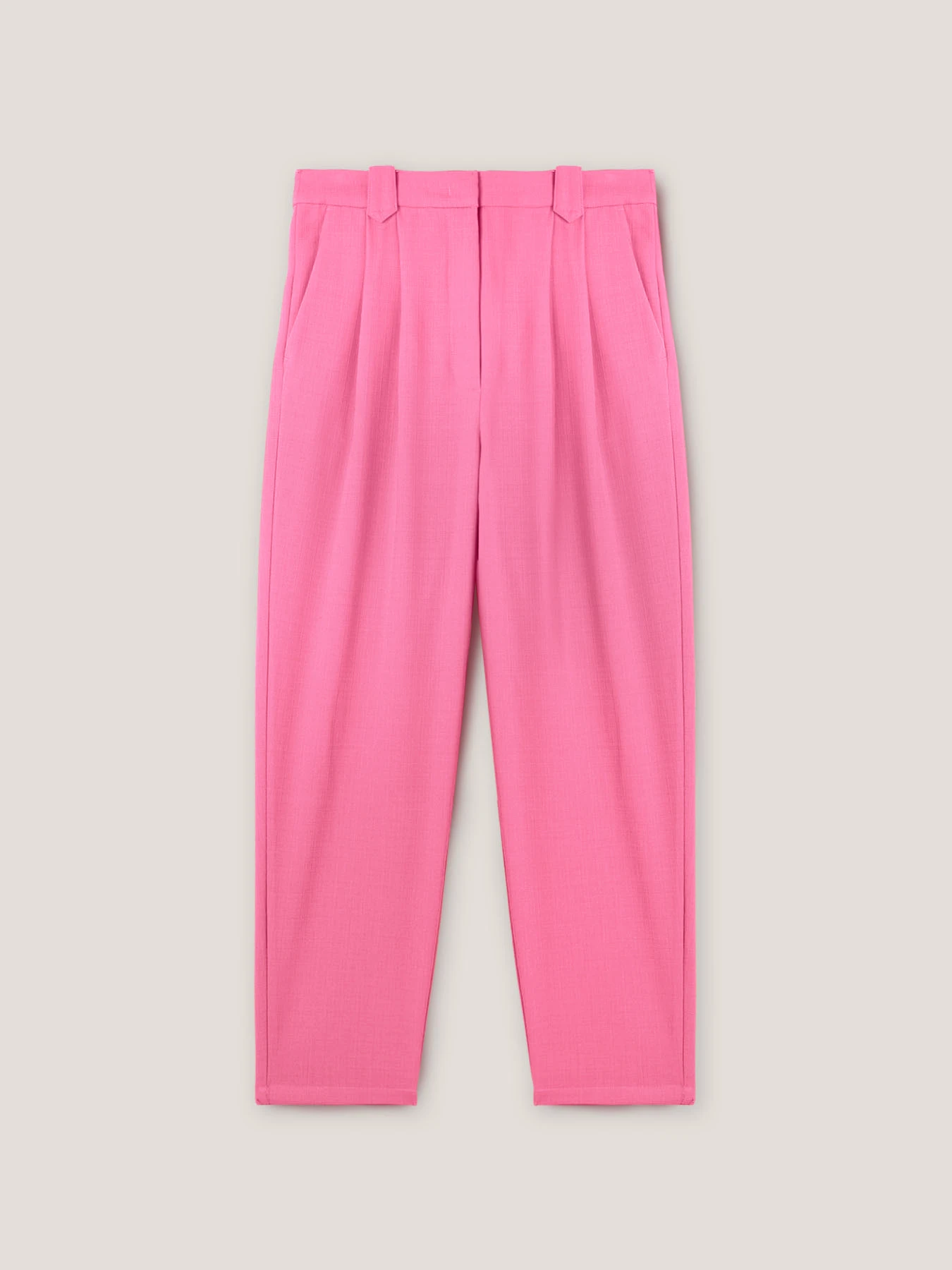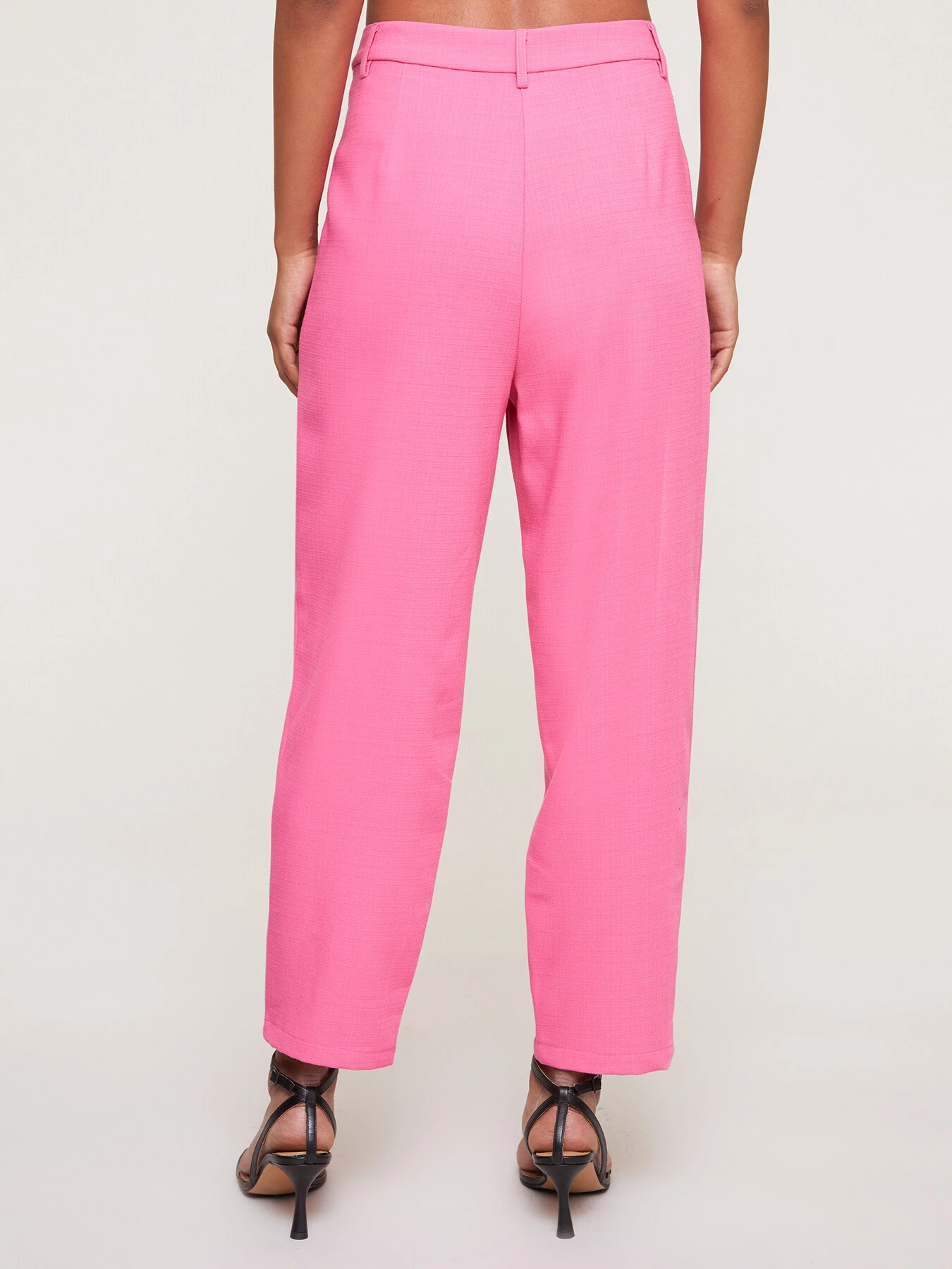 Pantaloni in tela misto viscosa; cintura con chiusura sartoriale e passanti; pinces nella parte superiore, tasche all’americana inserite nel fianco.