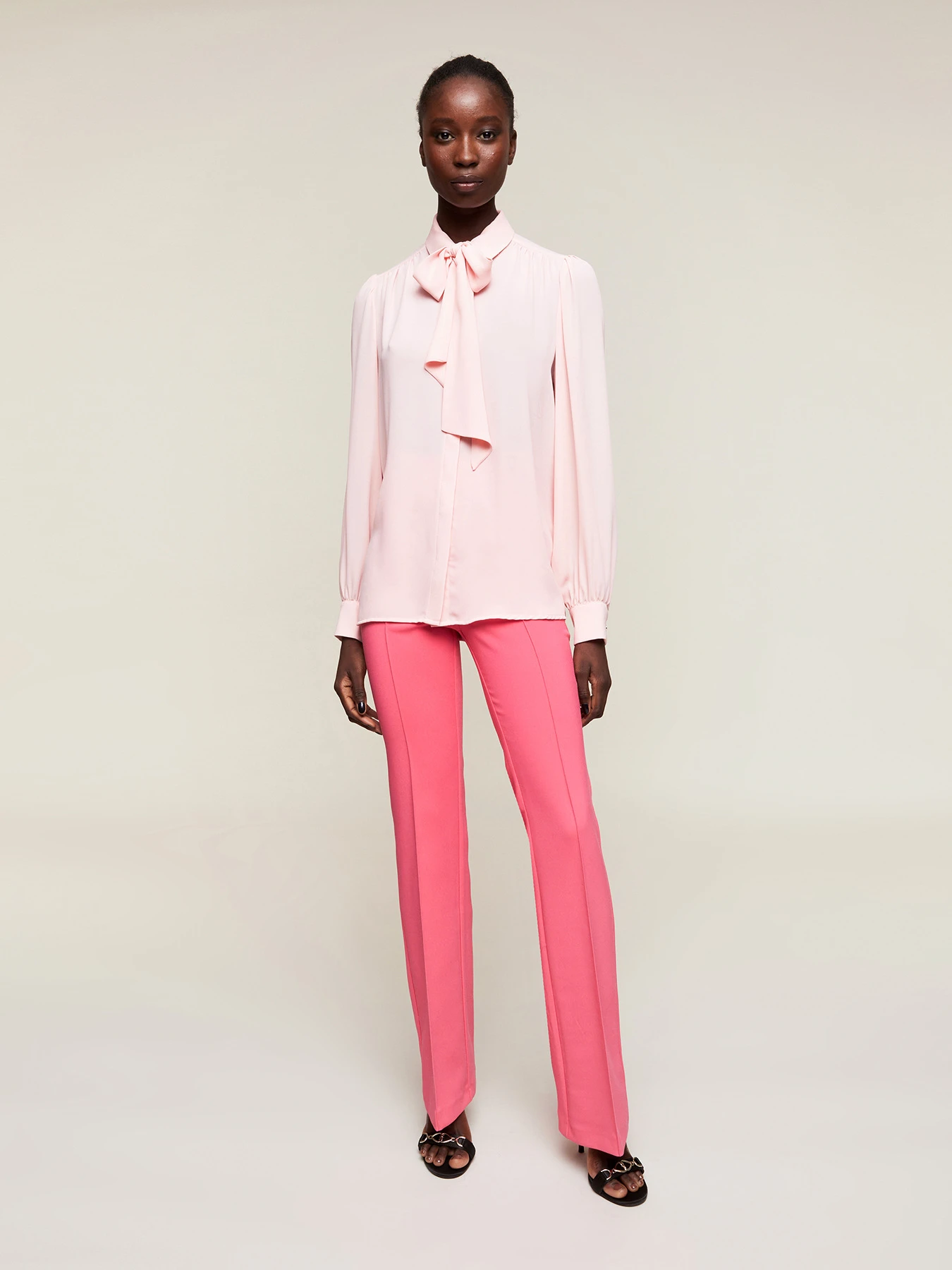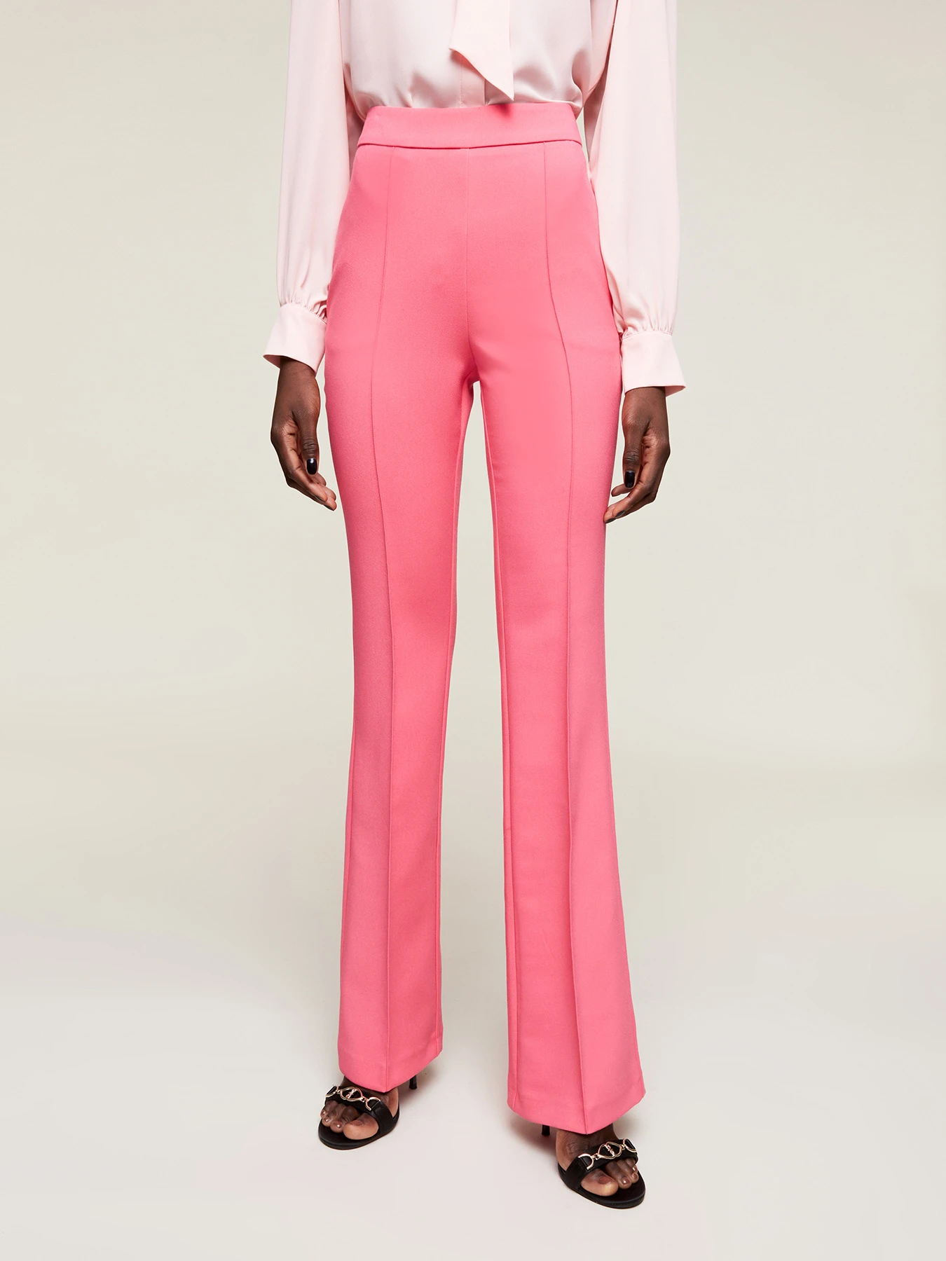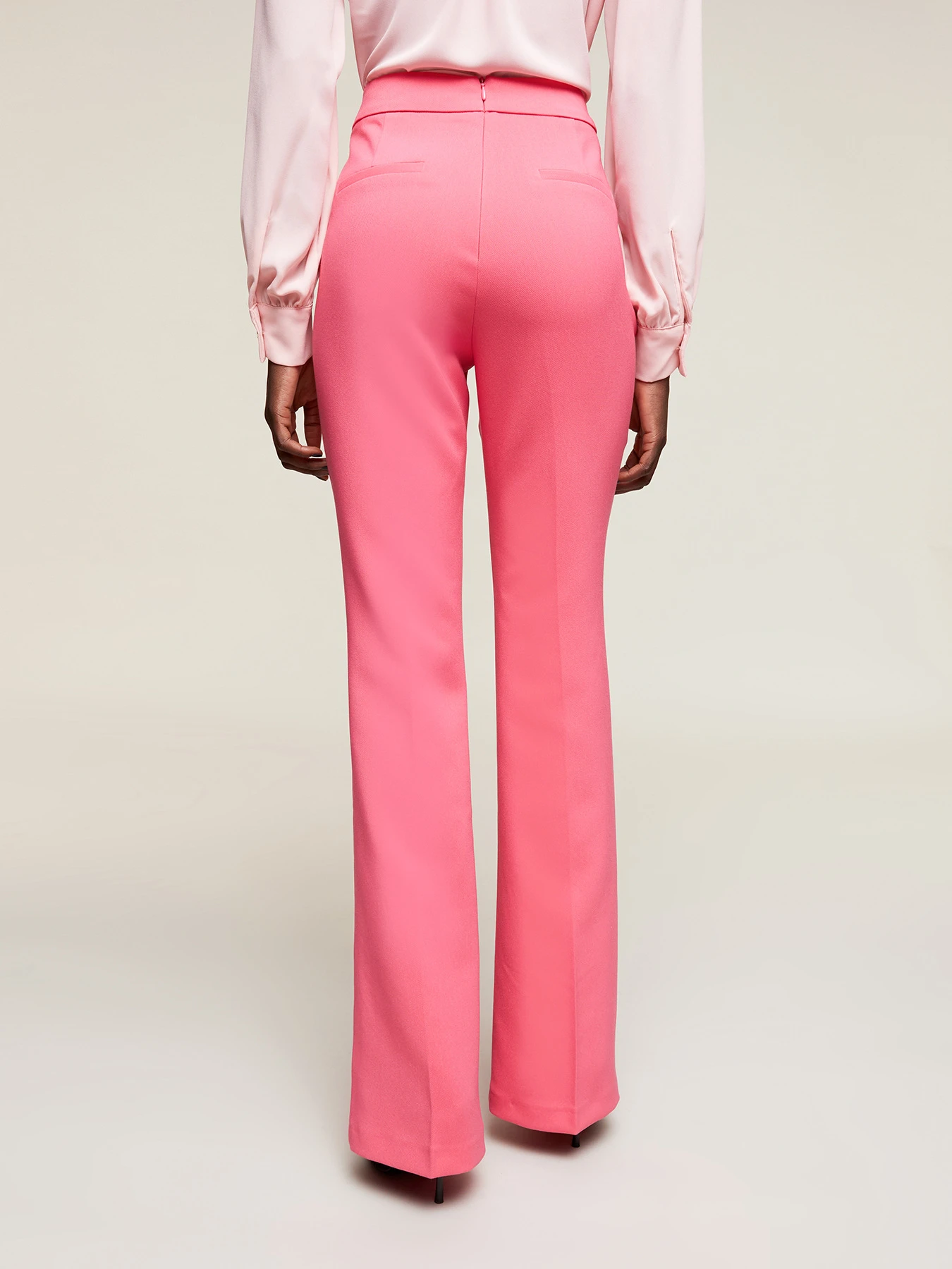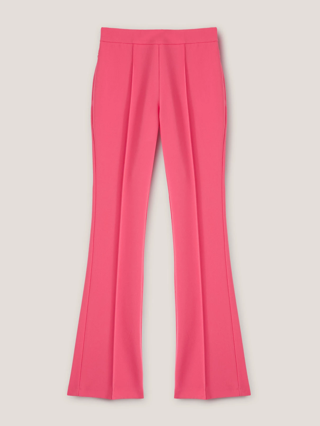 Pantaloni fit aderente con linea flare in tessuto a trama diagonale; tinta unita; tasche verticali e chiusura posteriore chiuse con zip invisibili; nervature nel centro gamba.
