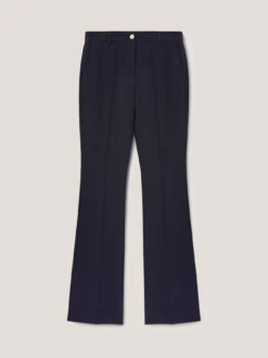Pantaloni in tessuto tecnico stretch; gamba flare e piega stirata nel centro; chiusura frontale con bottone e zip; tasche all’americana inserite nel fianco.
