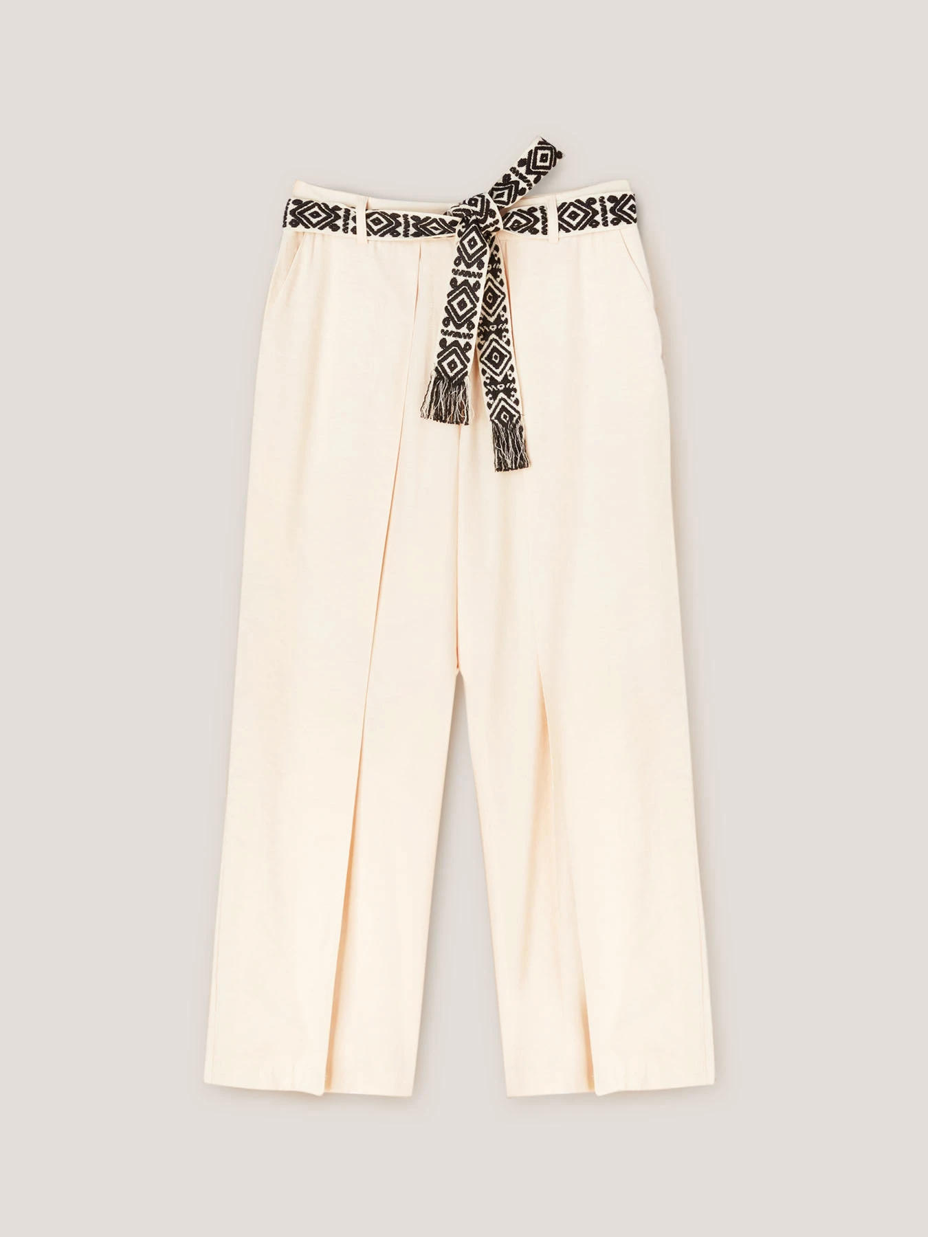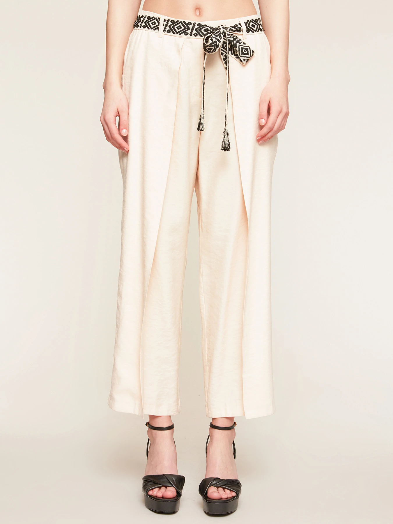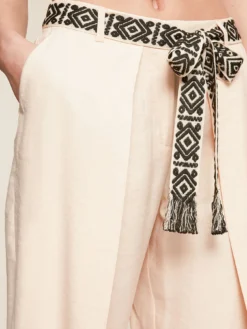 Pantaloni gamba larga effetto pareo in raso debacato misto viscosa; vita alta e chiusura con bottone e zip, tasche verticali inserite nel fianco; cintura in gros grain fantasia etnica.