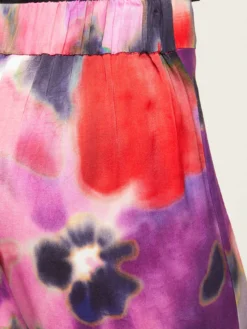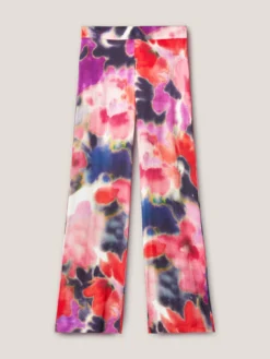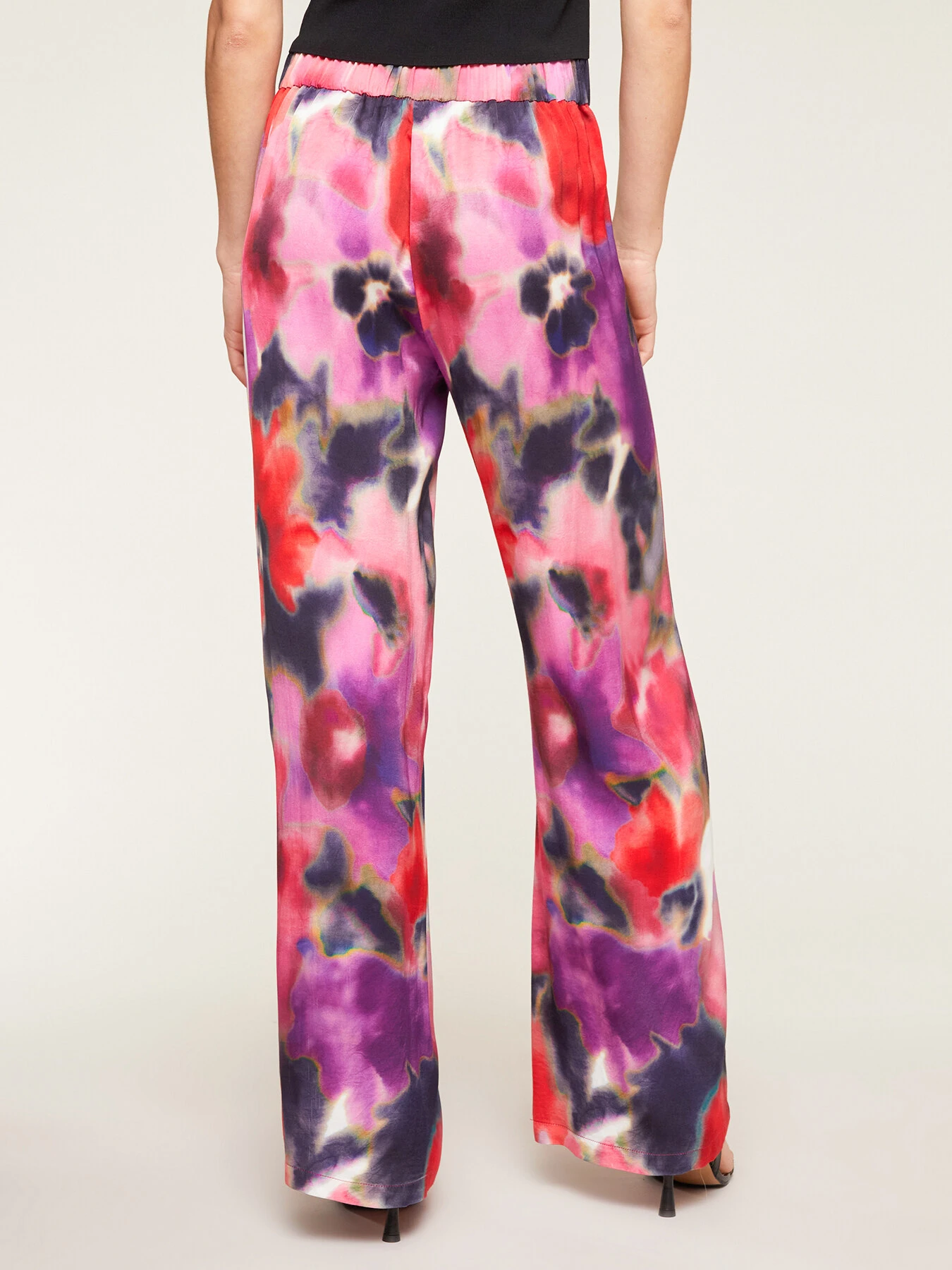 Pantaloni fluidi in raso fantasia floreale; vita elastica; gamba palazzo.