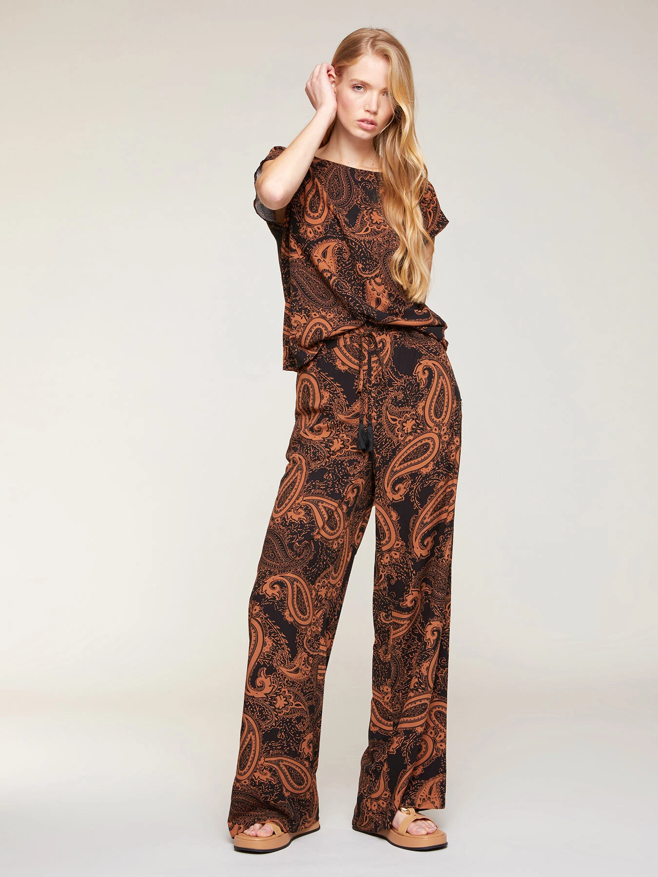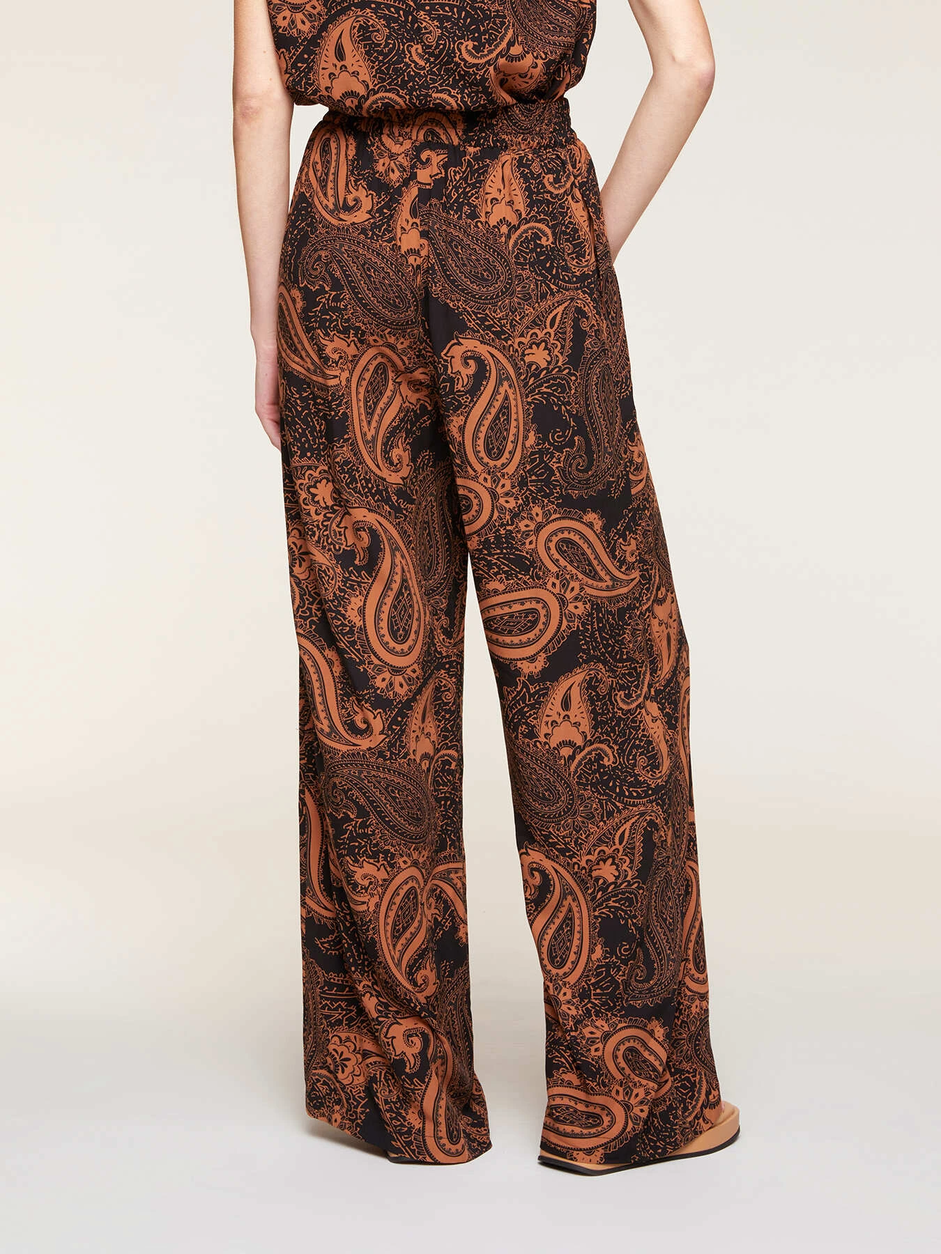 Pantaloni palazzo fluidi fantasia cashmere 100% viscosa; vita stretch con elastico interno e coulisse con nappe; tasche all’americana inserite nel fianco.