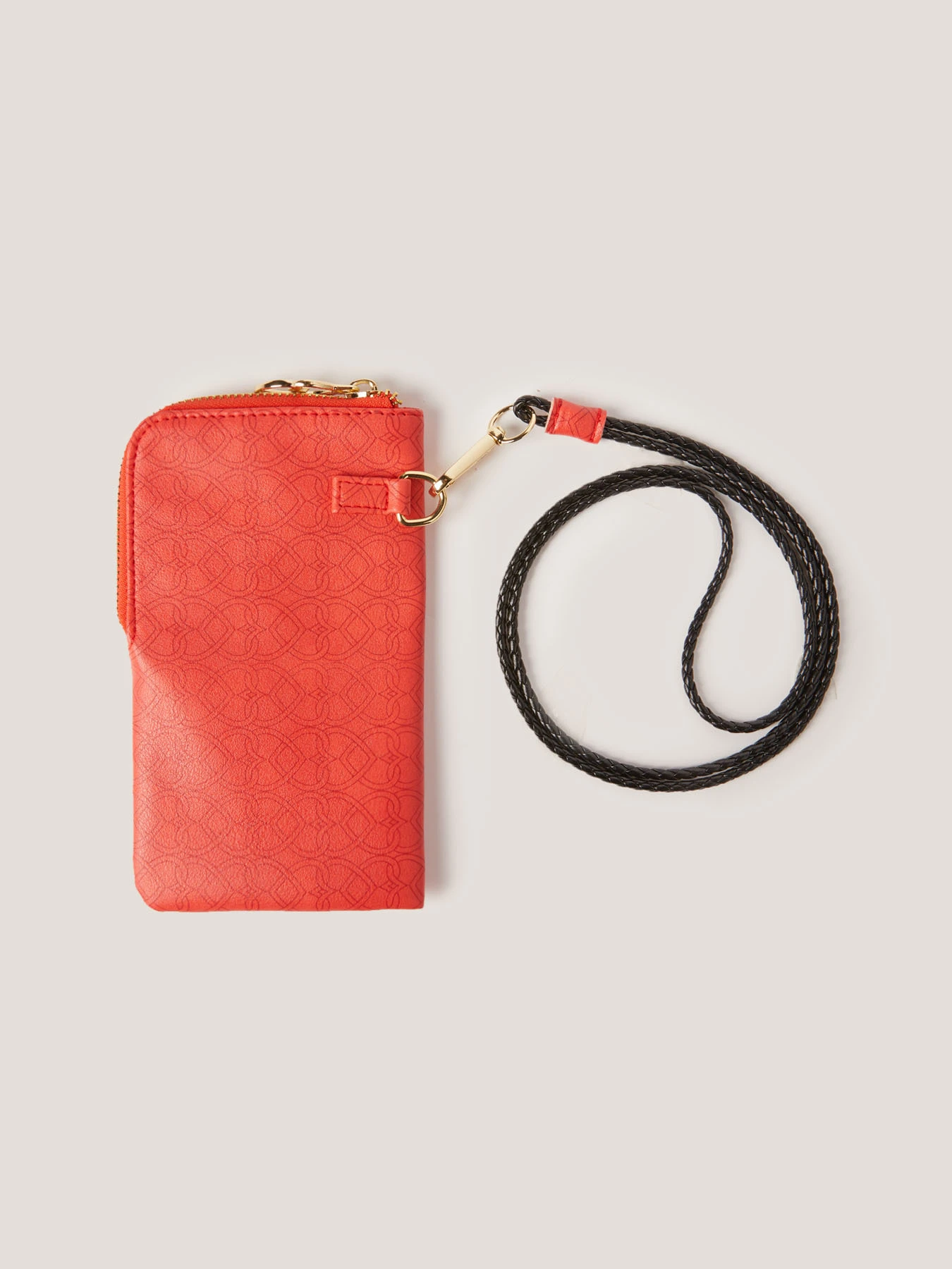 Portacellulare in similpelle; chiusura con zip metallica, laccio da collo con moschettone in corda; dimensioni 10×17 cm.
