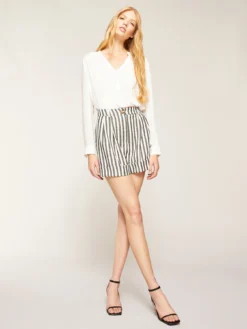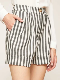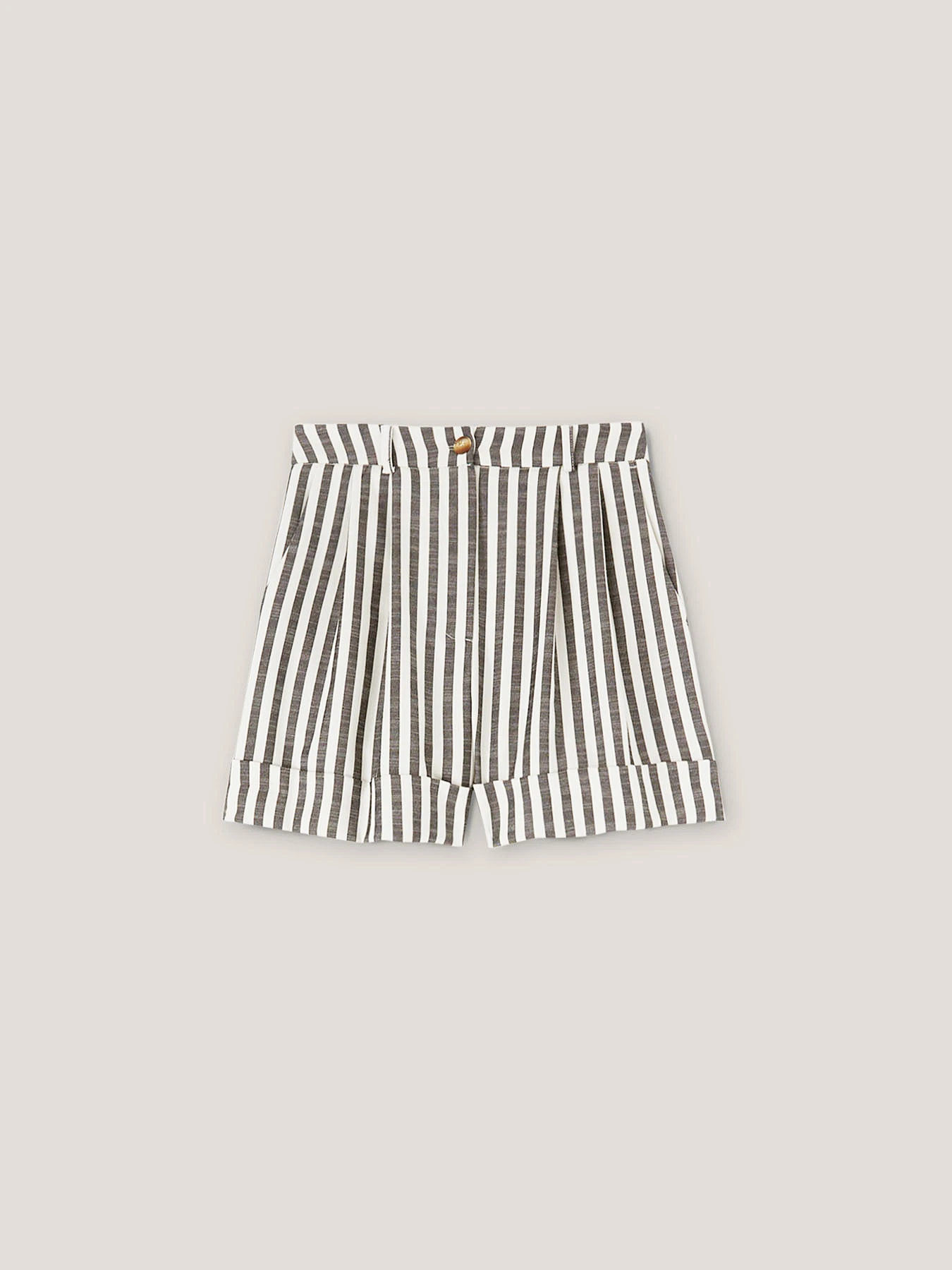 Shorts con pinces in tela misto viscosa fantasia a righe; chiusura frontale con bottone e zip; tasche verticali inserite nel fianco, risvolto impunturato su fondo gamba.