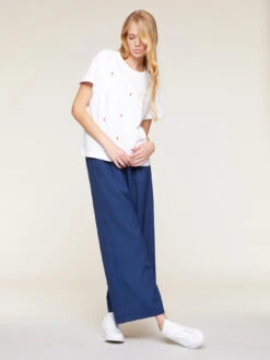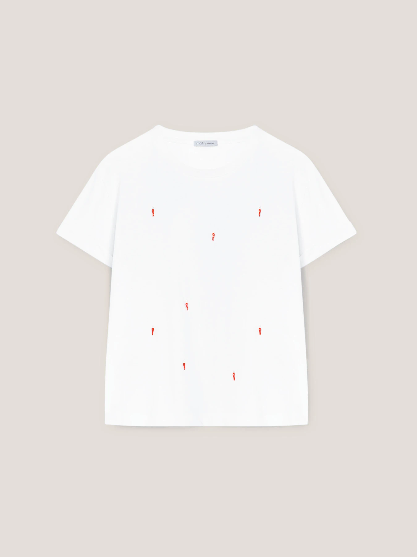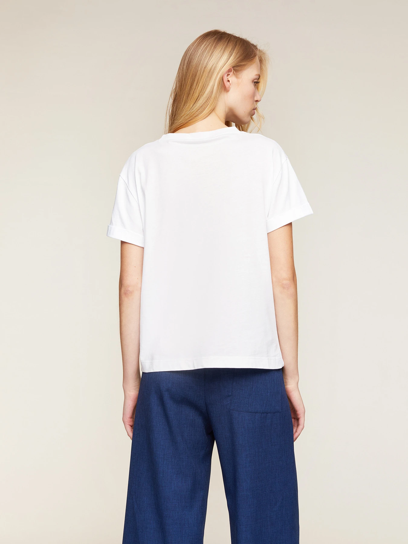 T-shirt in jersey di cotone tinta unita; modello boxy con scollo tondo e maniche corte con risvolto; applicazioni frontali ricamate.