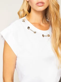 T-shirt in jersey di cotone; modello a kimono con maniche corte; scollo tondo con motivo ad occhielli e catenella gioiello.