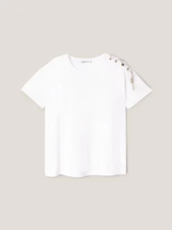 T-shirt over in jersey di cotone tinta unita; scollo tondo; maniche corte con taglio spalla sceso e motivo asimmetrico ad occhielli e catenella gioiello.