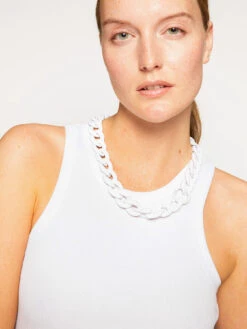 Top in jersey misto cotone a coste; scollo all’americana; collana a catena tono su tono.