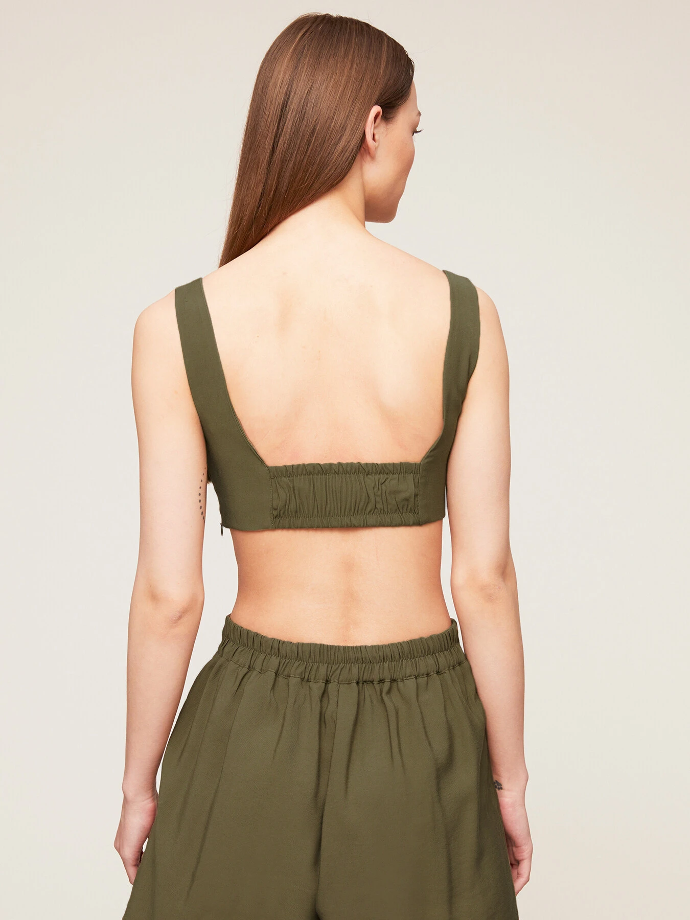 Top corto brassiere in tessuto misto viscosa; coppe sagomate, chiusura laterale con zip; spalla larga, parte elastica posteriore.