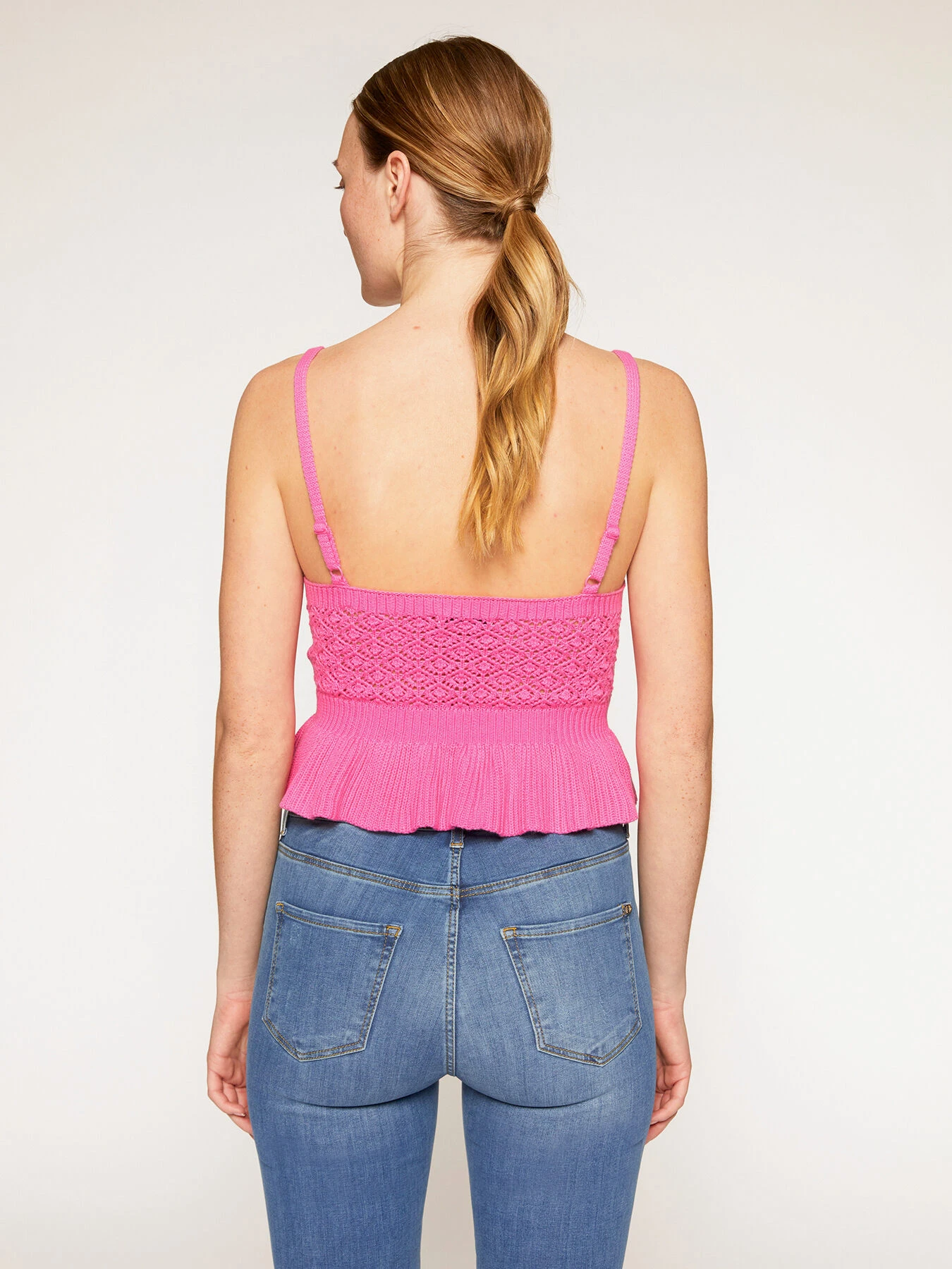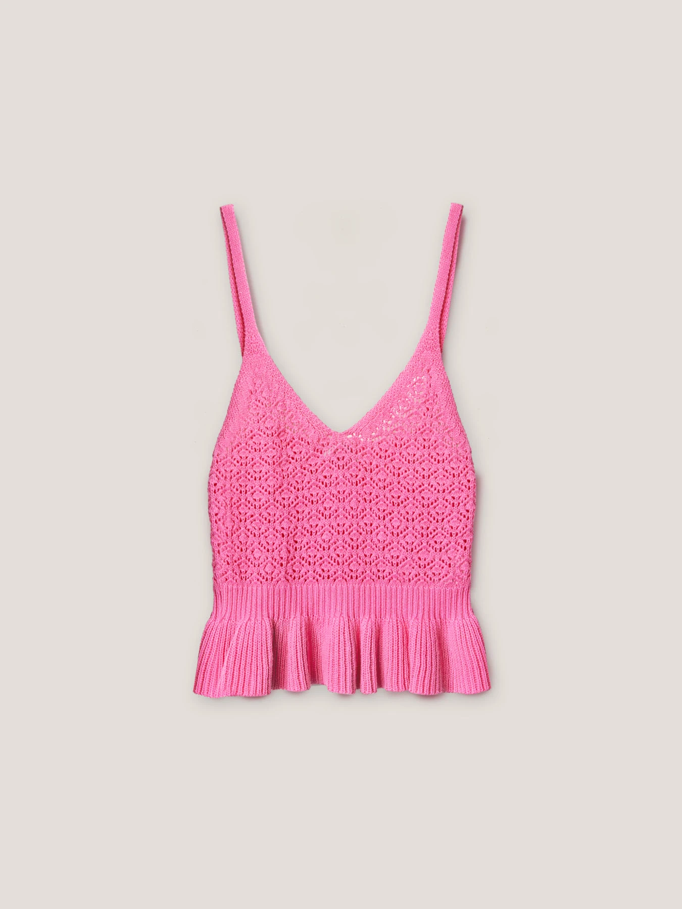 Top corto in crochet di cotone tinta unita; scollo a v frontale e spalline fini regolabili; balza sul fondo.