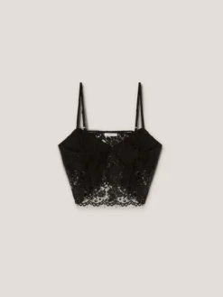 Top corto in pizzo; scollo a cuore con coppe sagomate; spalline fini regolabili, chiusura laterale con zip.