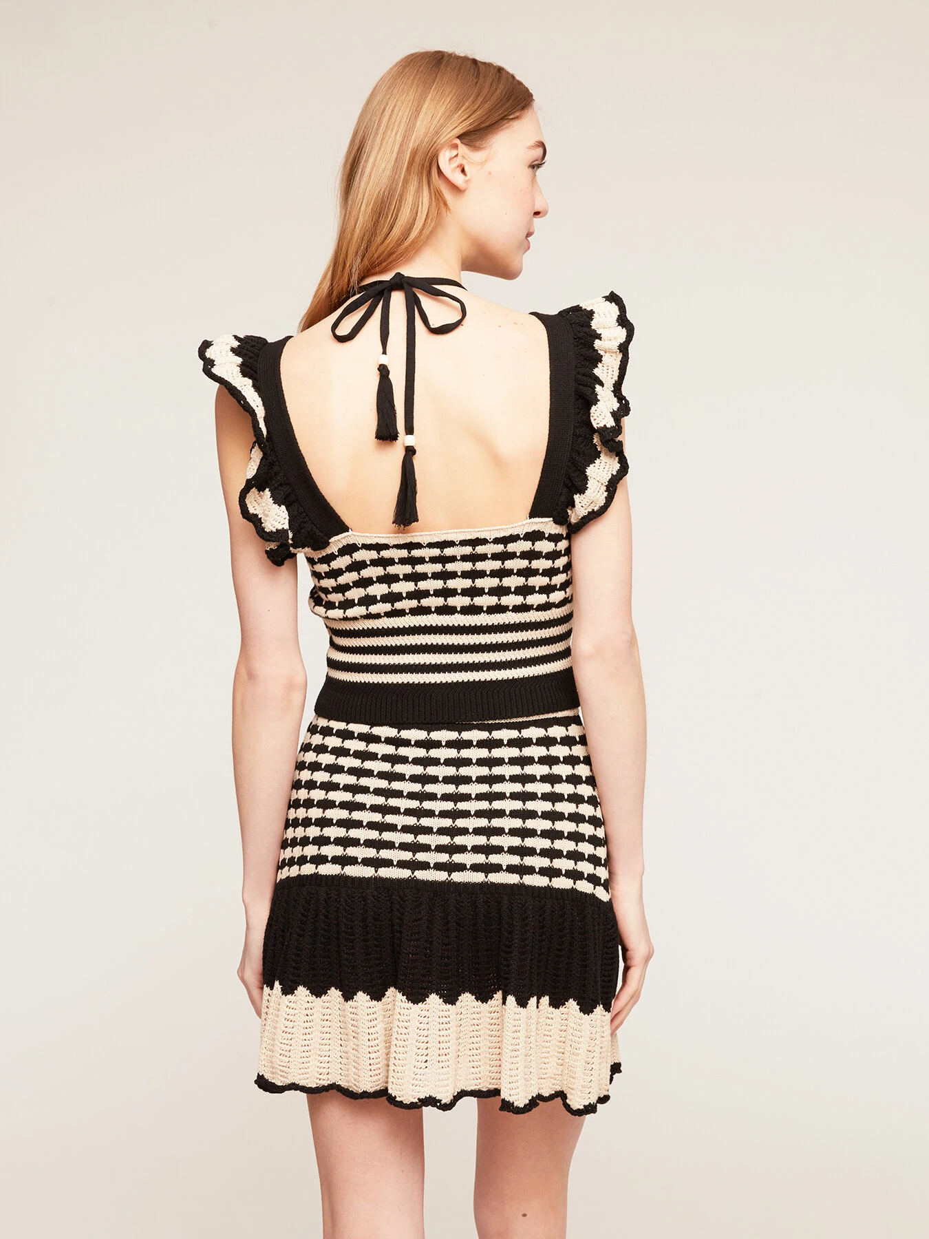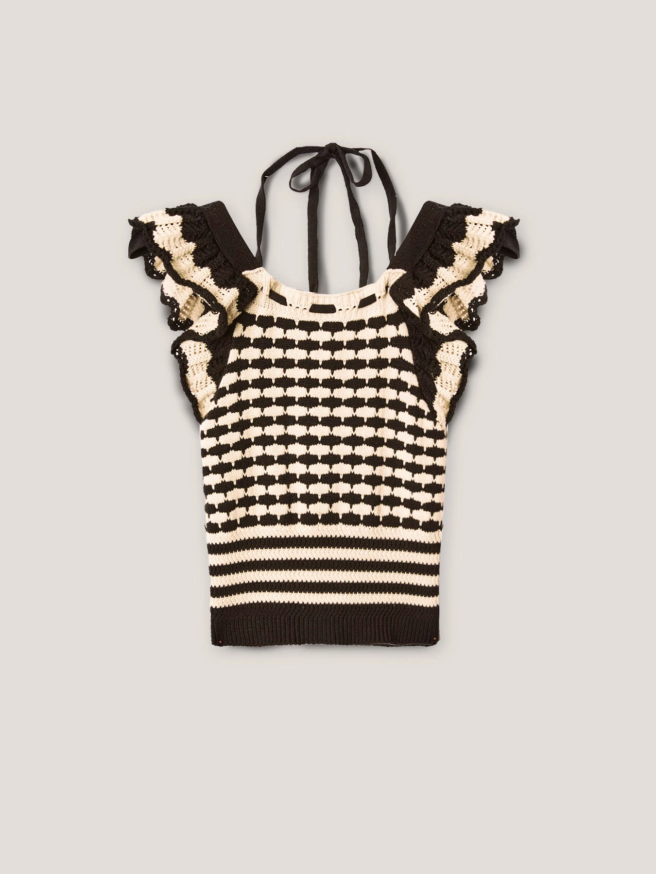 Top in crochet bicolor 100% cotone; scollo ampio con motivo lacci; maniche corte ad aletta con doppia rouches.