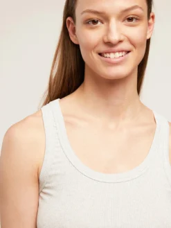 Top lurex in jersey a coste misto viscosa; modello a spalla larga; scollo tondo.