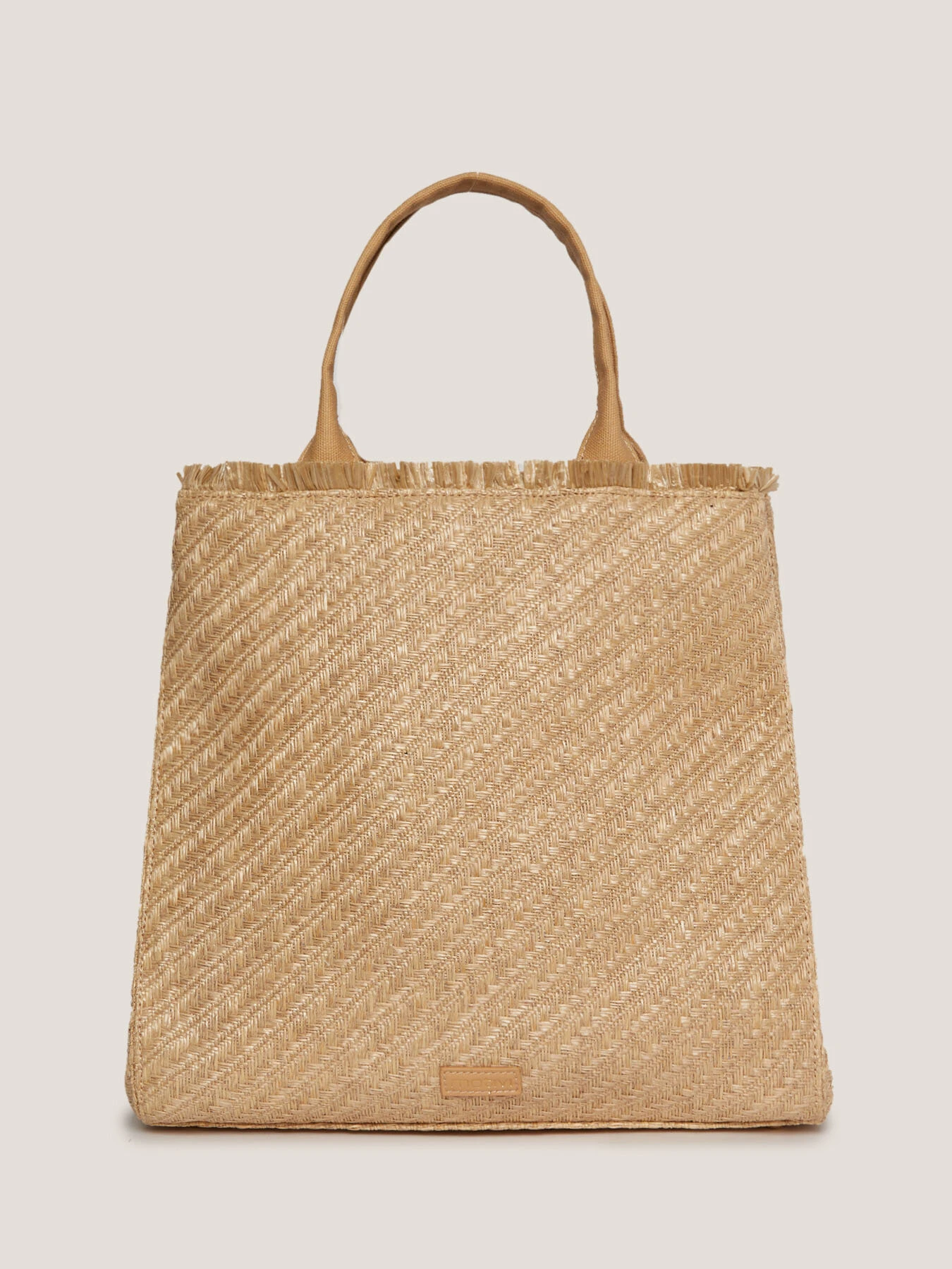 Tote bag in rafia con manici in ecopelle; tracolla regolabile in canvas unito, placca metallica Double Love, tasca interna; dimensioni: altezza 33 cm, larghezza 32 cm, ampiezza 12 cm.