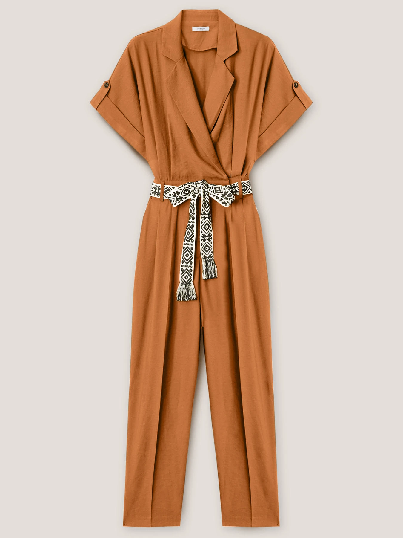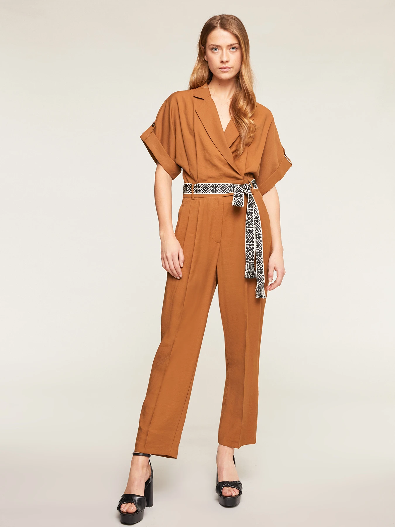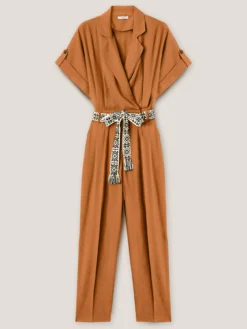 Tuta in tessuto fluido misto viscosa tinta unita; scollo a v con colletto a revers, maniche corte a kimono con risvolto; vita elasticizzata sulla parte posteriore e cintura in gros grain; chiusura frontale con cerniera e gancetti.