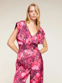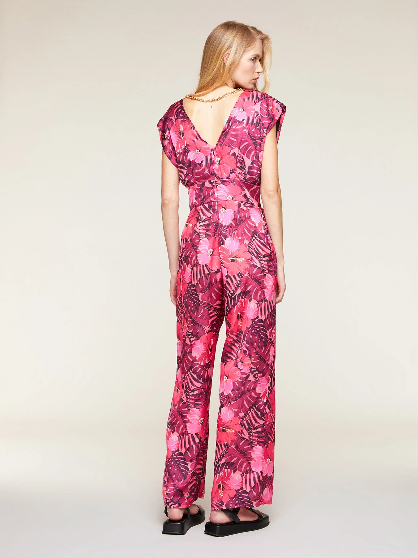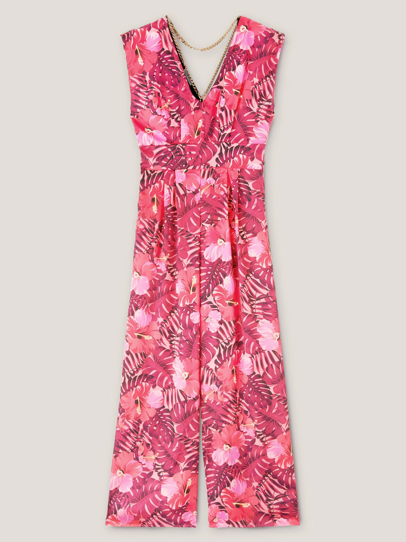 Tuta elegante in raso fantasia floreale foderato internamente; corpino con profondo scollo a v e motivo catenella, maniche corte a kimono; gamba palazzo, apertura con zip nel centro dietro.