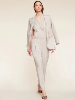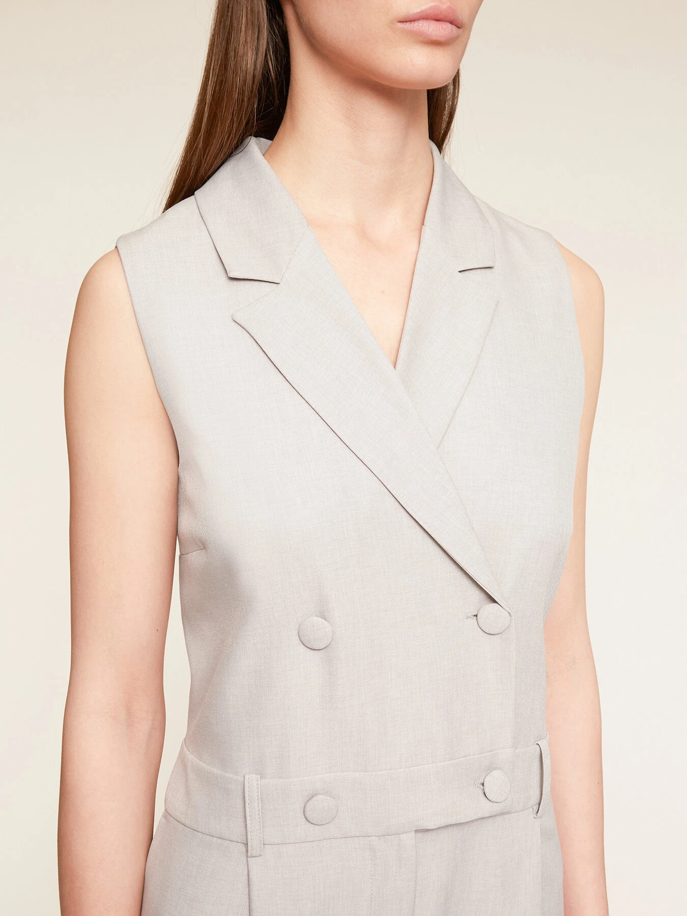 Tuta lunga doppiopetto in tessuto formale tinta unita; chiusura frontale con colletto a revers e bottoni foderati; modello senza maniche, tasche all’americana inserite nel fianco. MADE IN ITALY