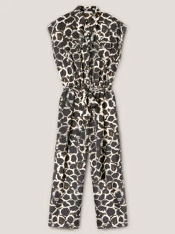 Tuta lunga in raso fantasia animalier; chiusura frontale con bottoni a vista e colletto a vela; tasche con patta applicate, tasche verticali inserite nel fianco; fusciacca tono su tono in vita.