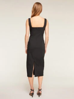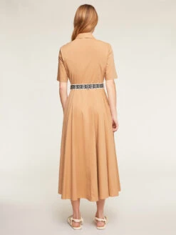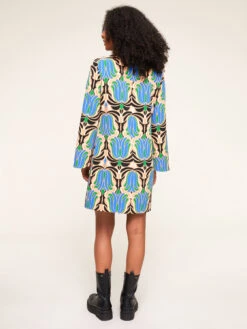 Tuta lunga in raso fantasia animalier; chiusura frontale con bottoni a vista e colletto a vela; tasche con patta applicate, tasche verticali inserite nel fianco; fusciacca tono su tono in vita.