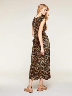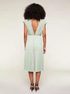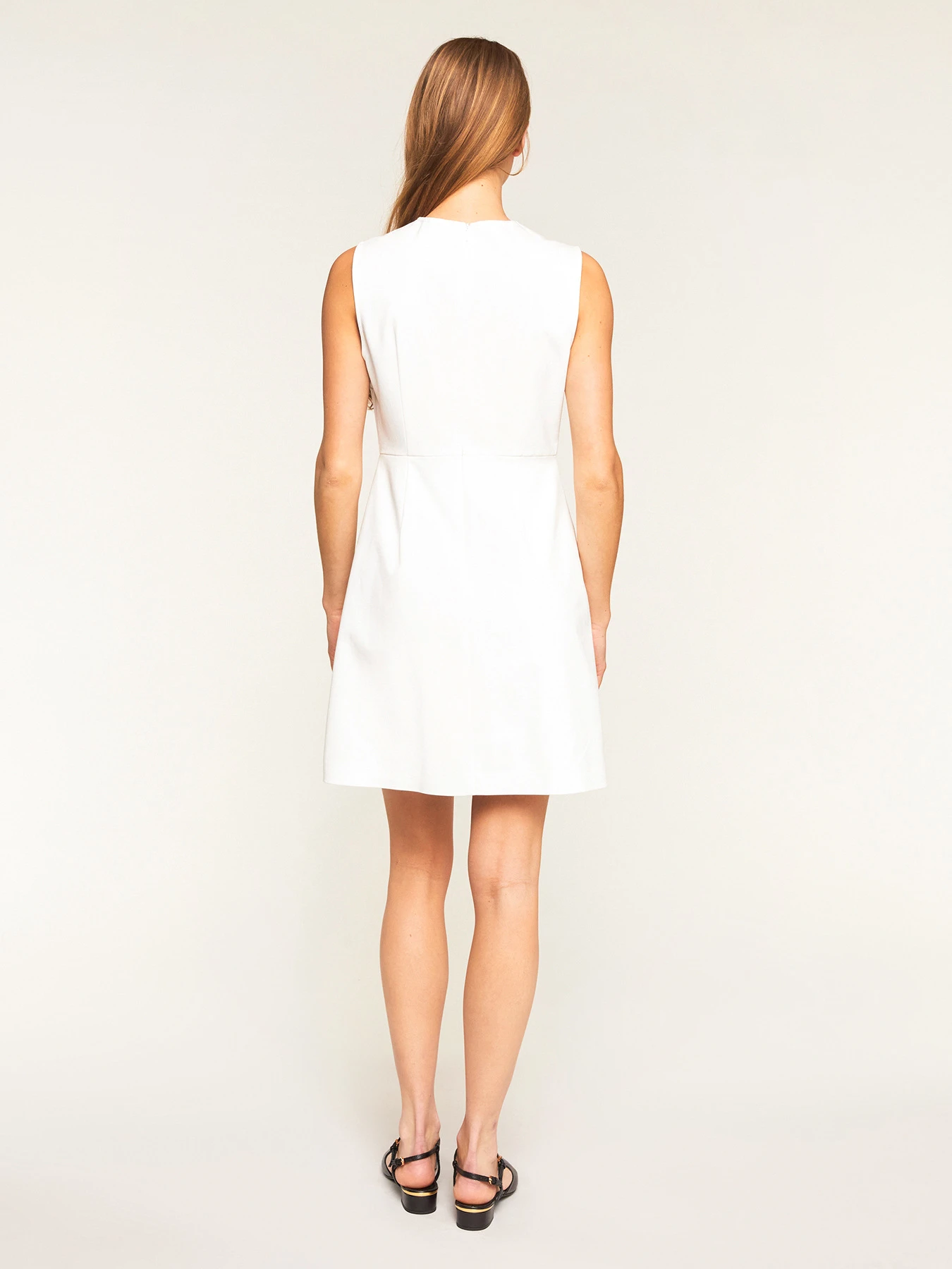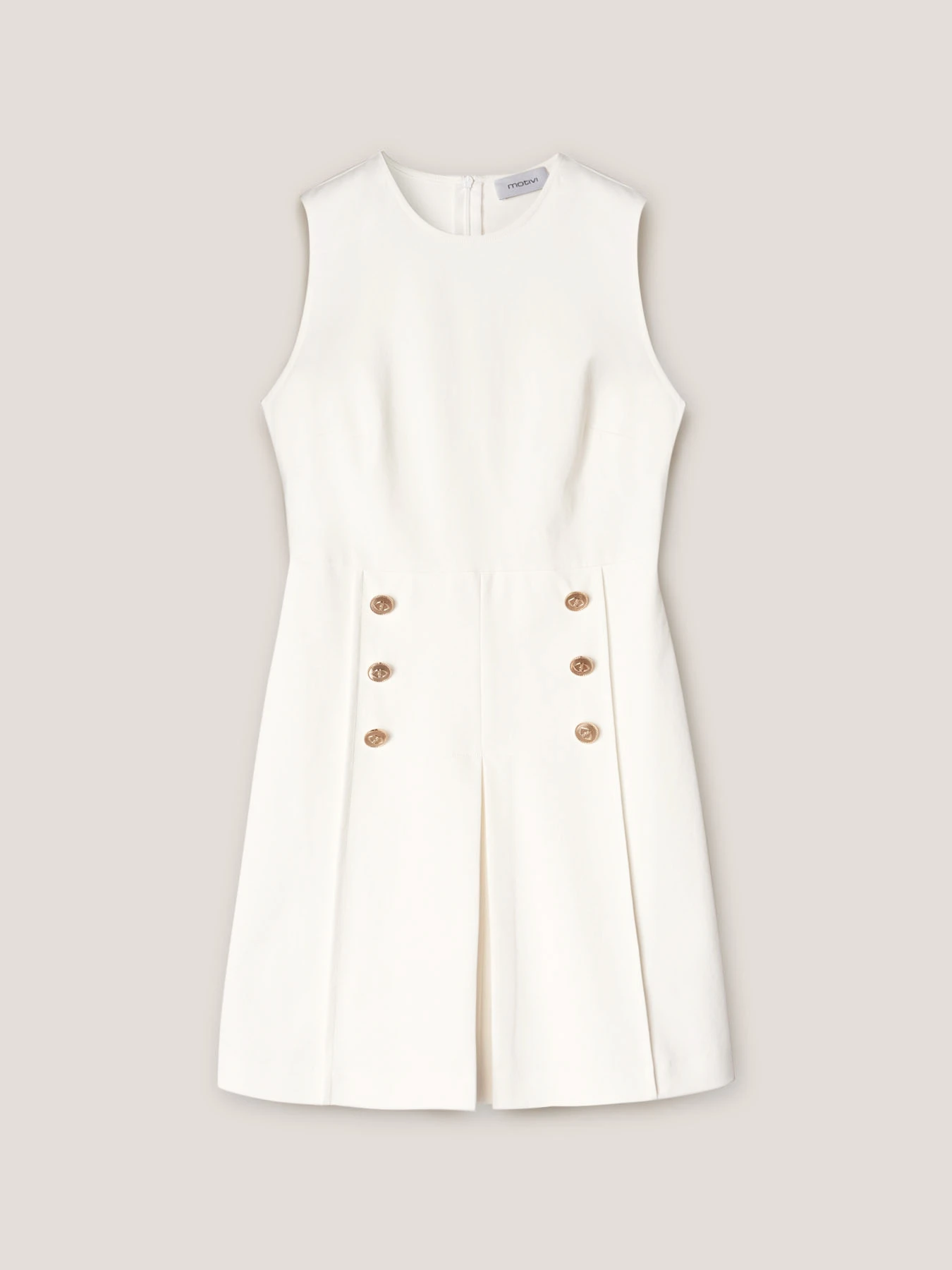 Vestito a tubino in punto milano tinta unita; chiusura con zip nel centro dietro; gonna corta con motivo bottoni e piega a soffietto.