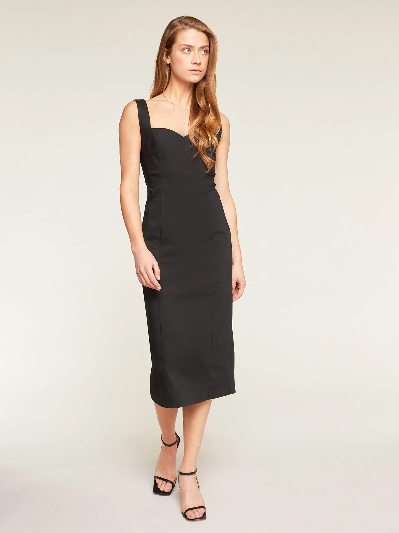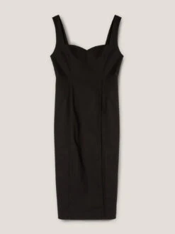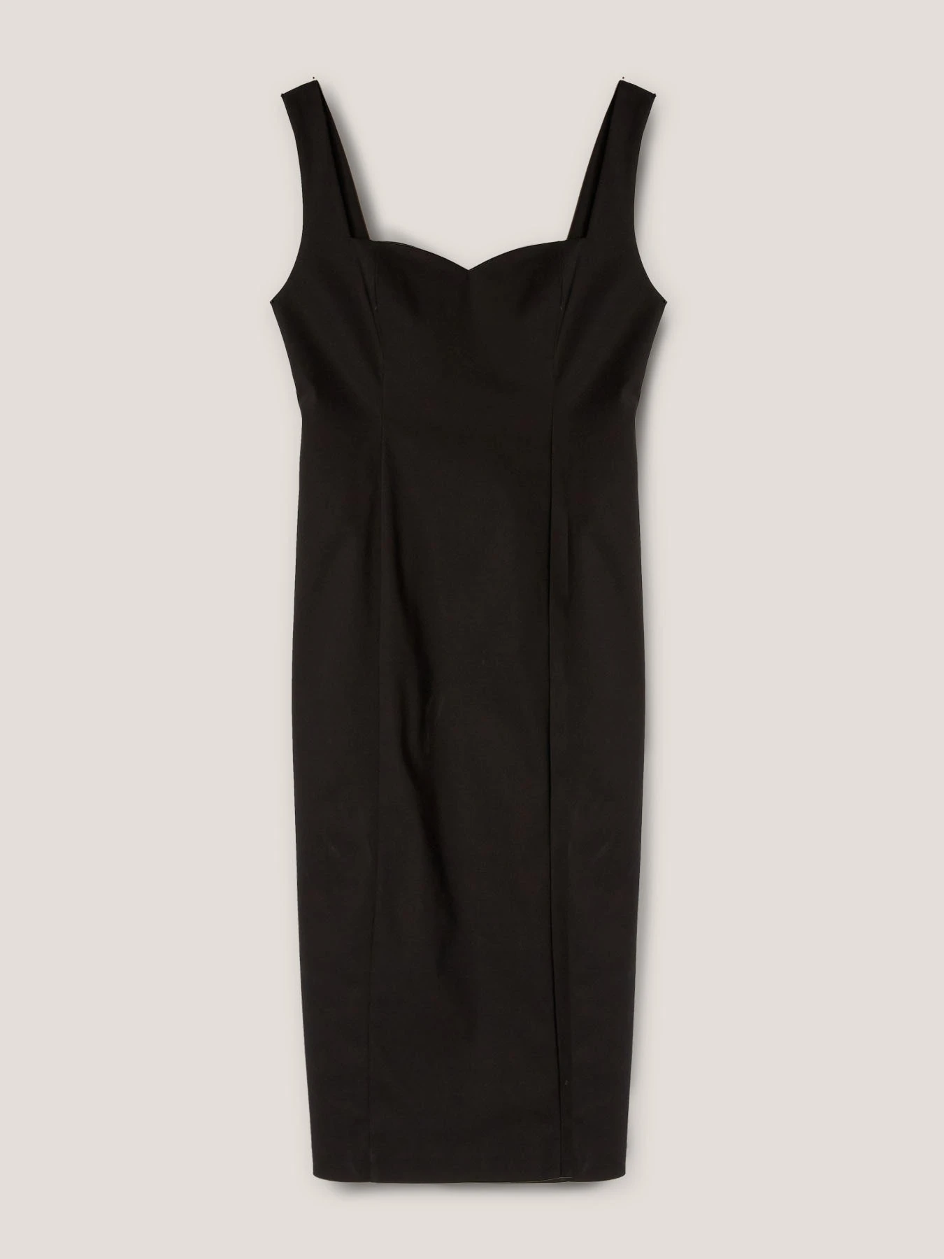 Vestito midi a tubino in tessuto tecnico stretch; scollo frontale a cuore e spalline larghe; vestibilità slim, chiusura con zip nel centro dietro.