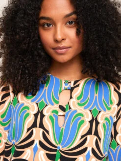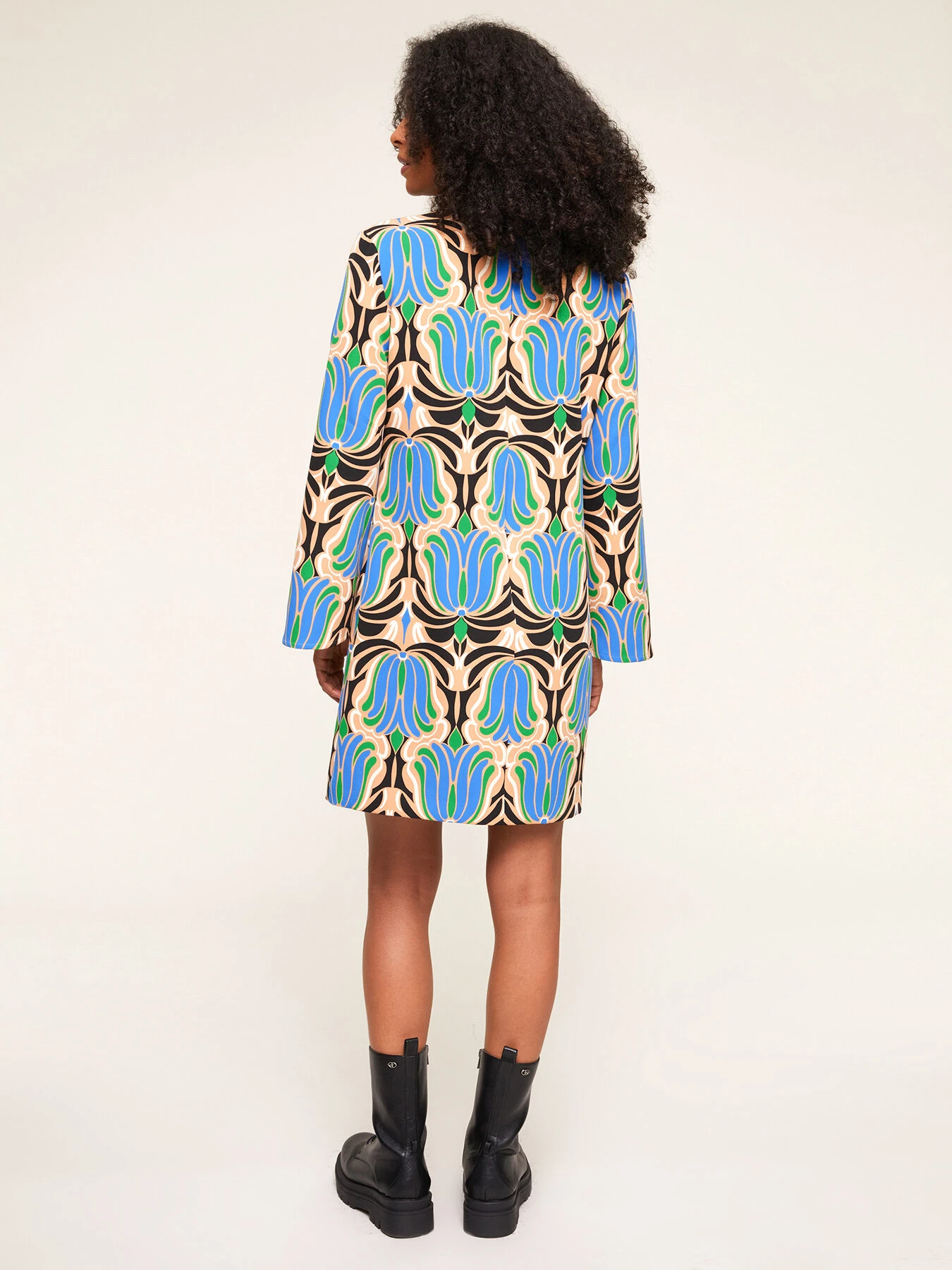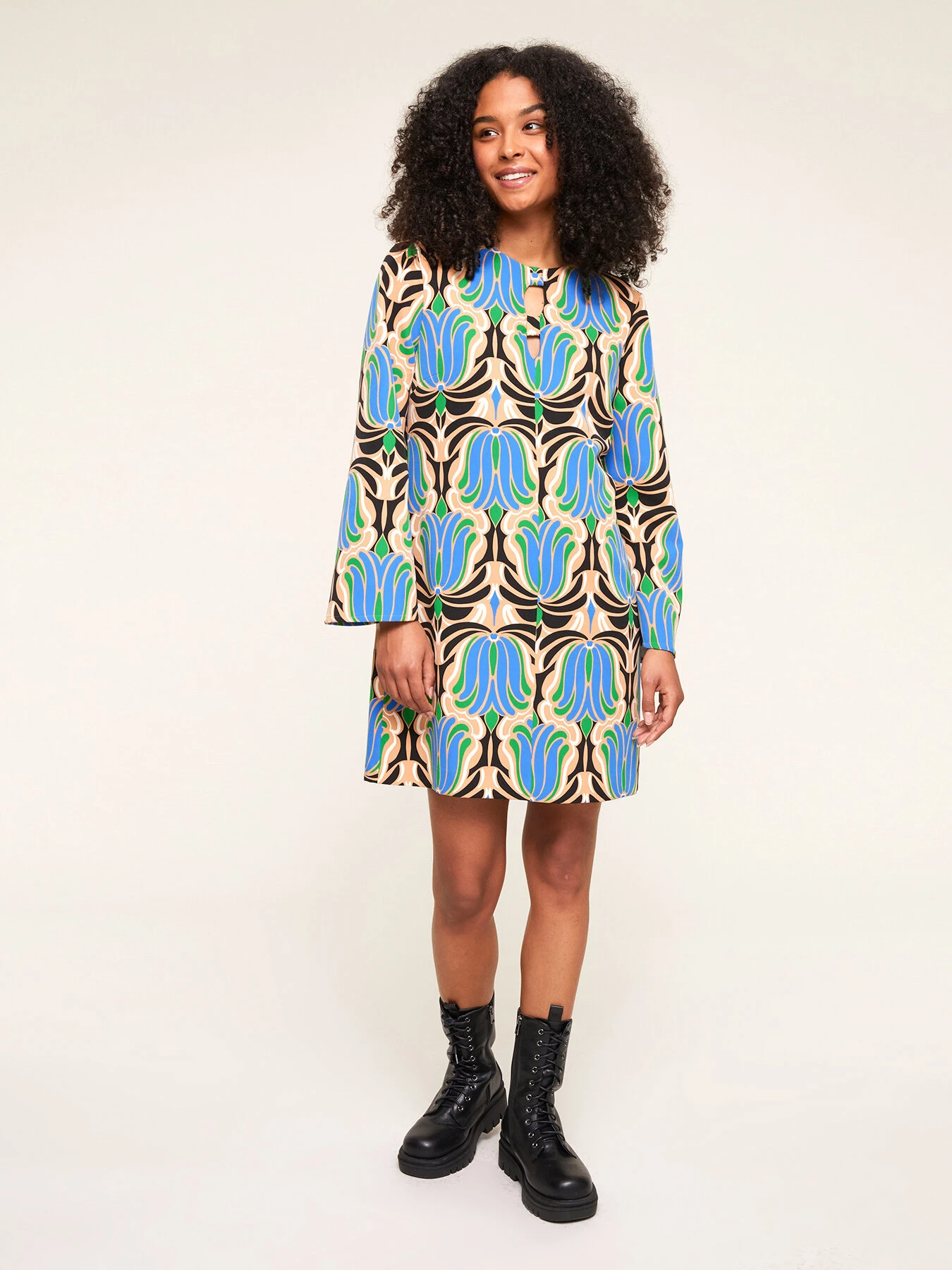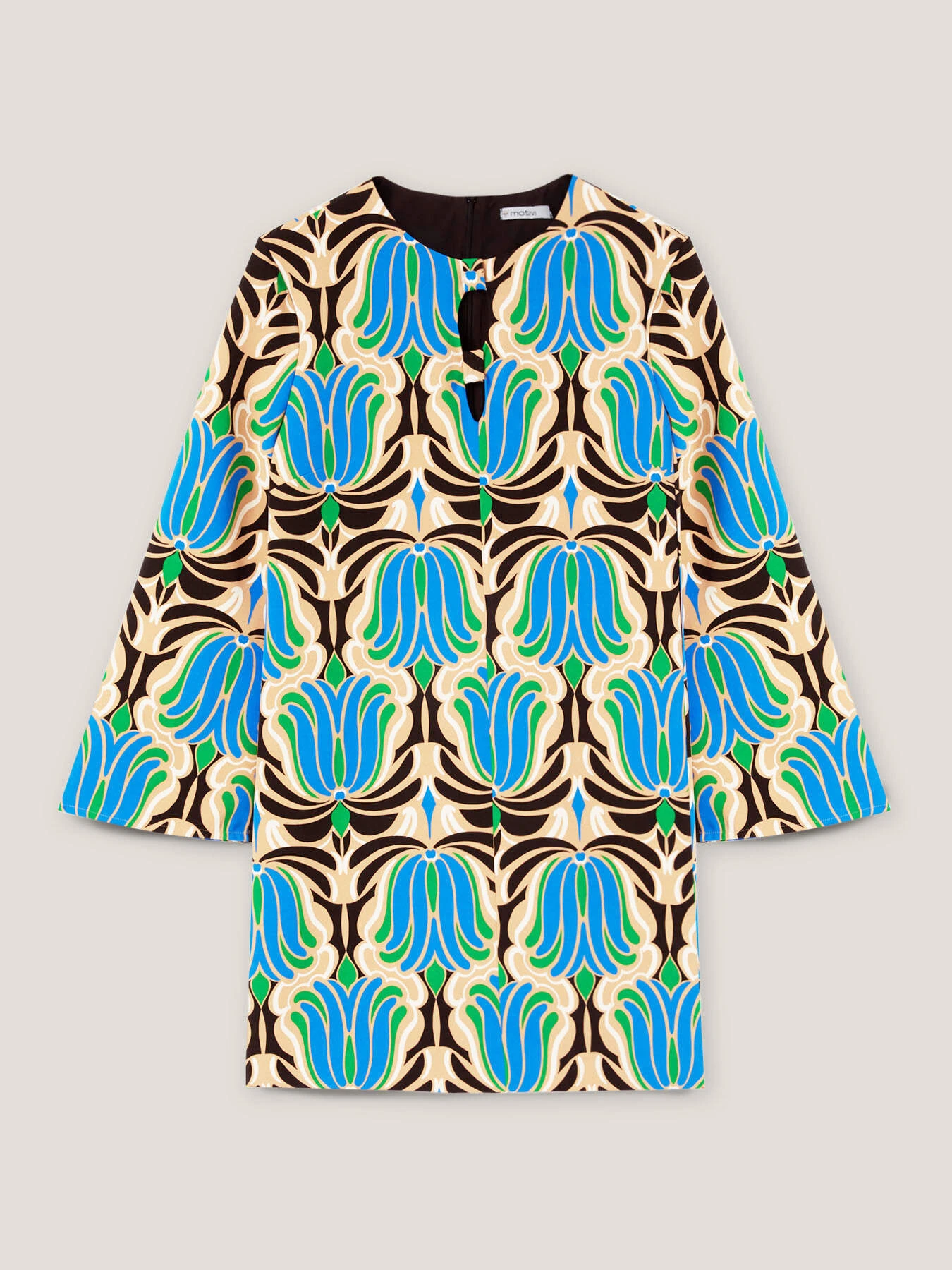 Vestito a tunica fantasia mattonella; scollo tondo con chiusura a zip posteriore; maniche lunghe ampie.