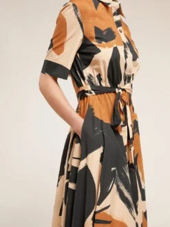 Vestito chemisier in cotone stampa etnica; chiusura frontale con colletto a vela e bottoni effetto madreperla; maniche corte, fusciacca in vita tono su tono, tasche verticali inserite nel fianco; Scegliendo i nostri prodotti in cotone state supportando il nostro contributo alla missione di Better Cotton promuovendo una produzione più responsabile del cotone. Questo prodotto proviene da un sistema di bilancio di massa e pertanto potrebbe non contenere Better Cotton.