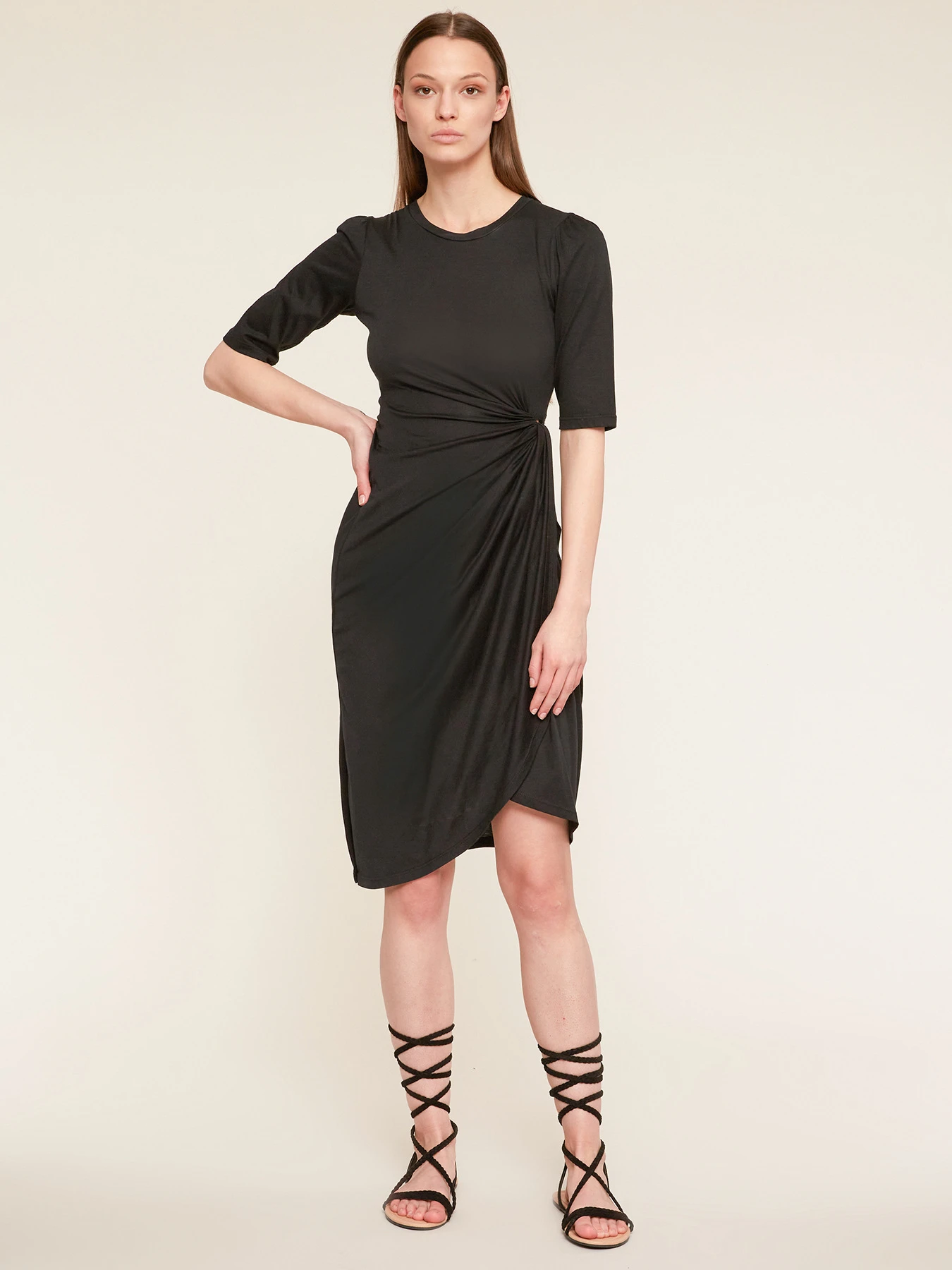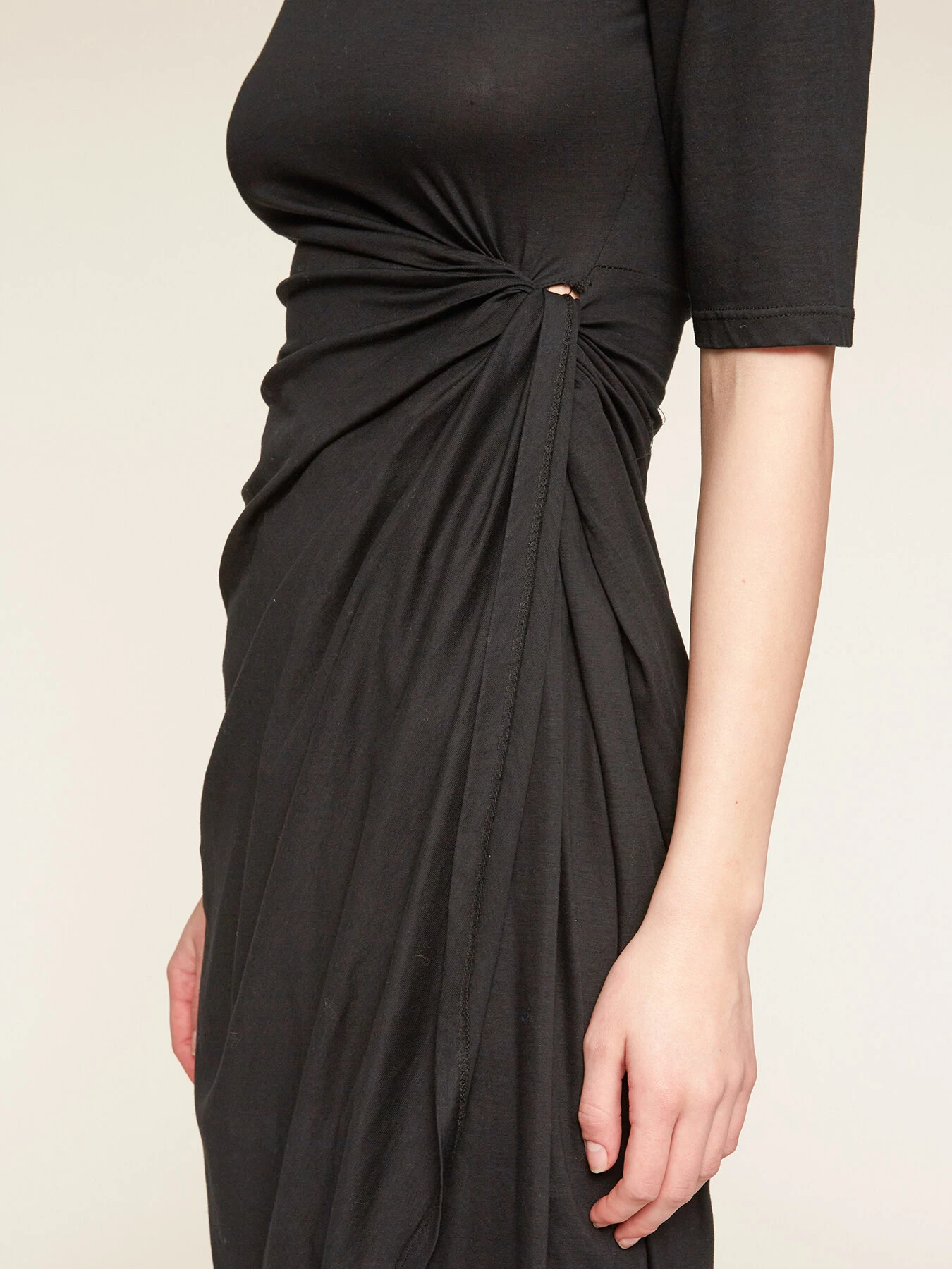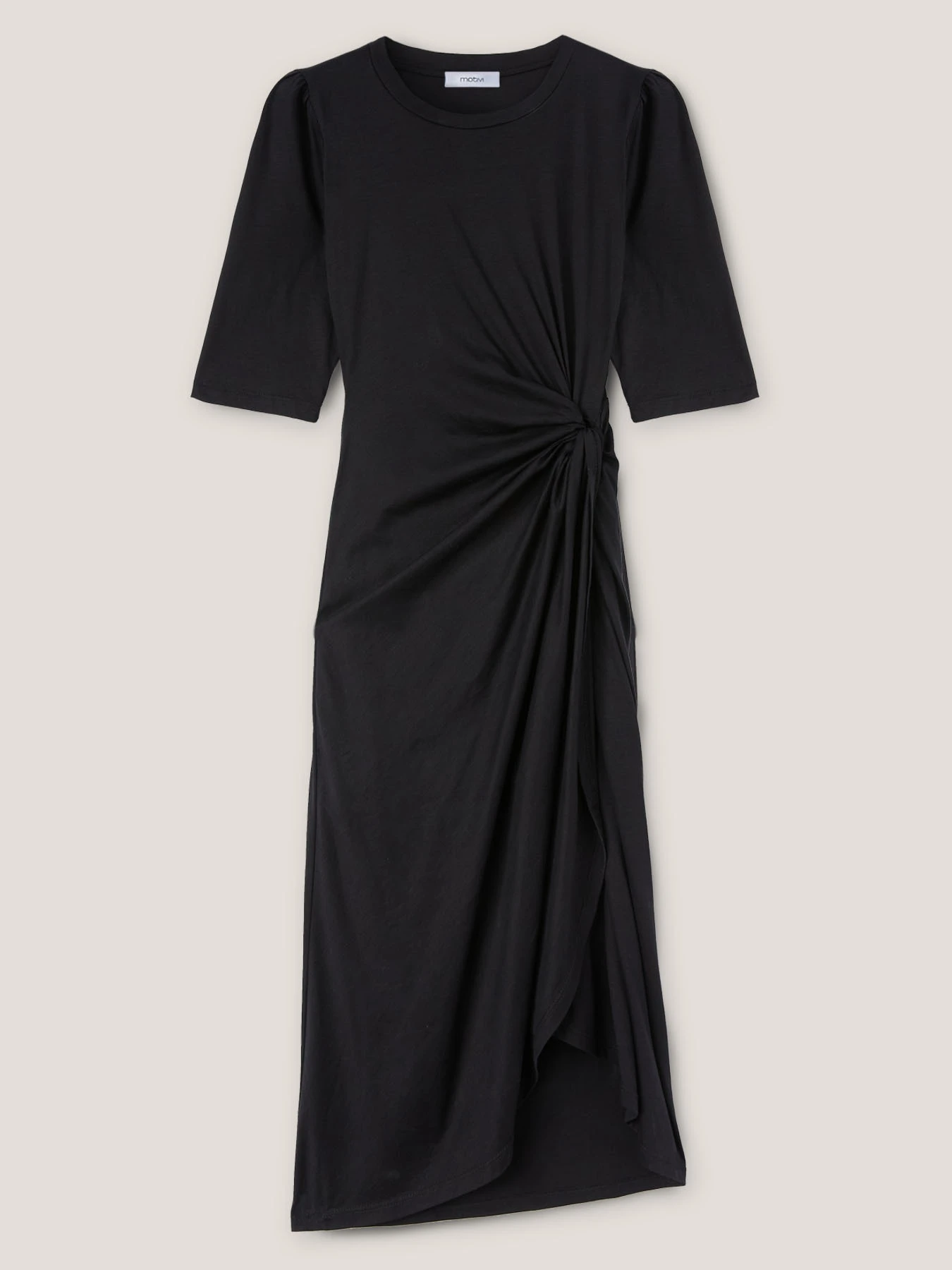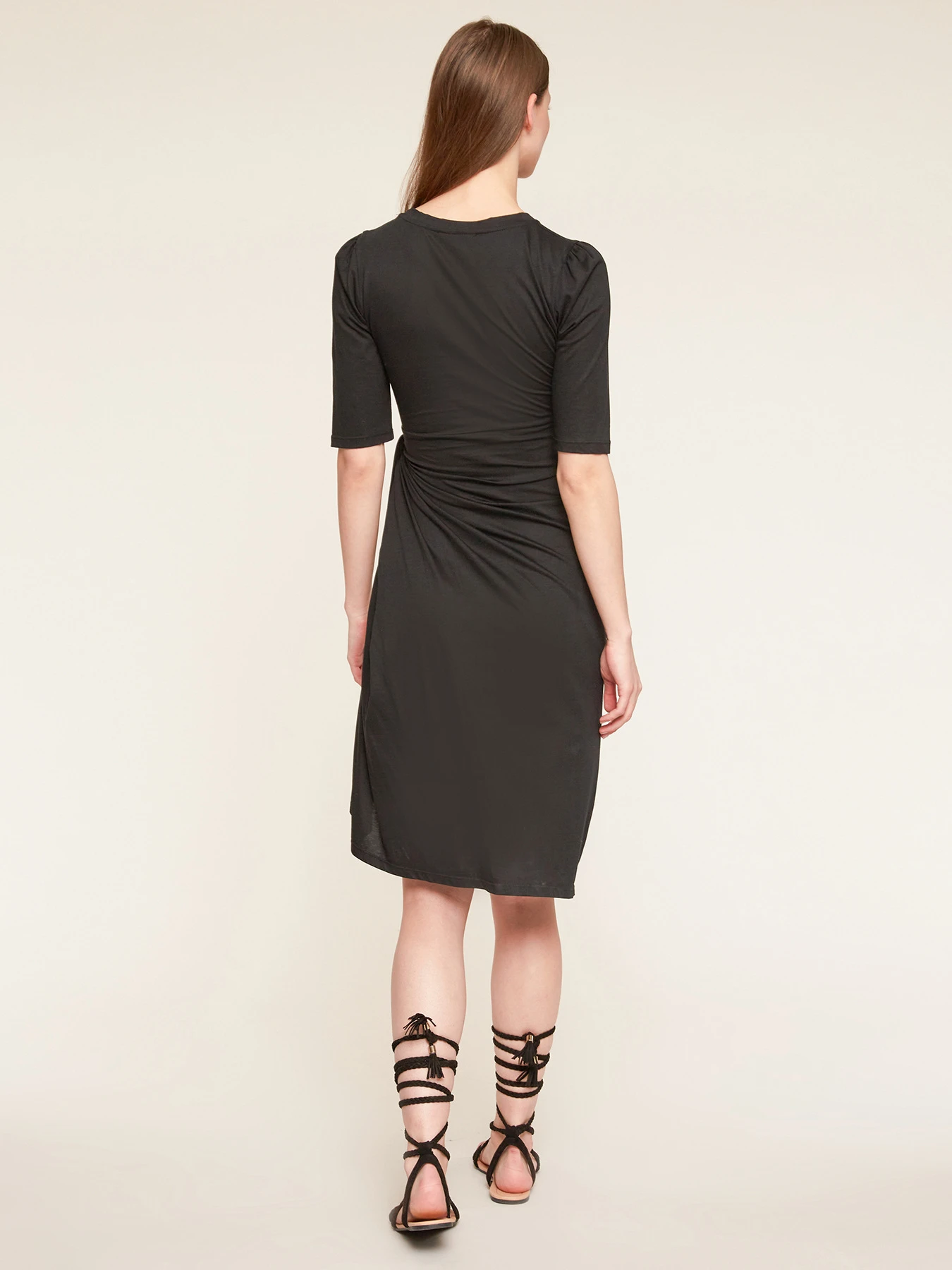 Vestito corto in jersey misto modal tinta unita; modello a maniche corte con scollo tondo; motivo di torchon laterale.