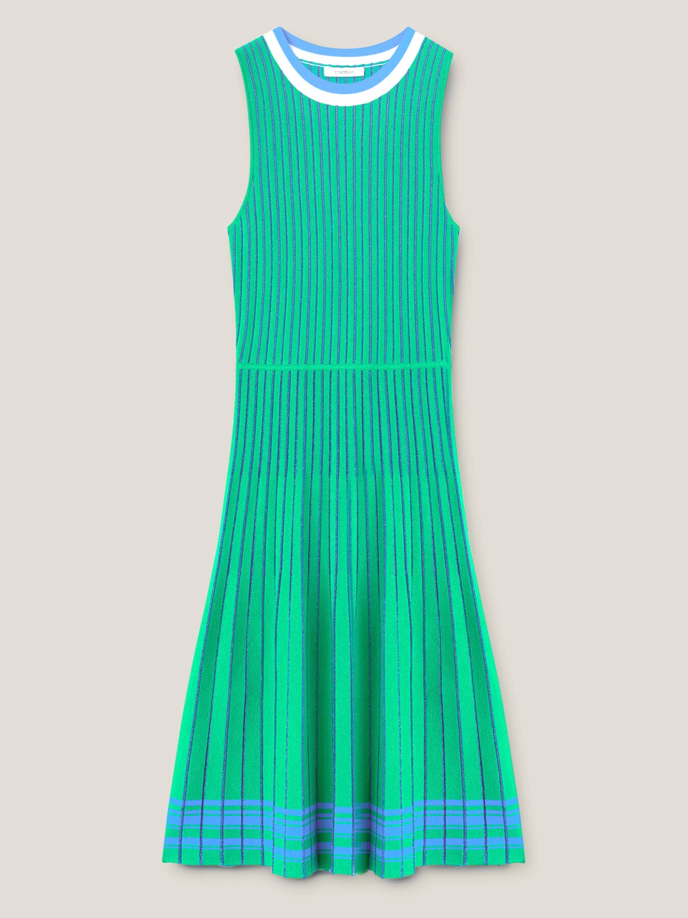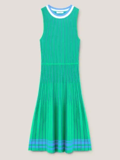 Vestito in maglia misto viscosa lurex; modello smanicato con scollo tondo e spalla larga; gonna corta svasata con lavorazione plissé.