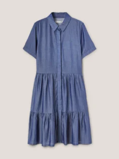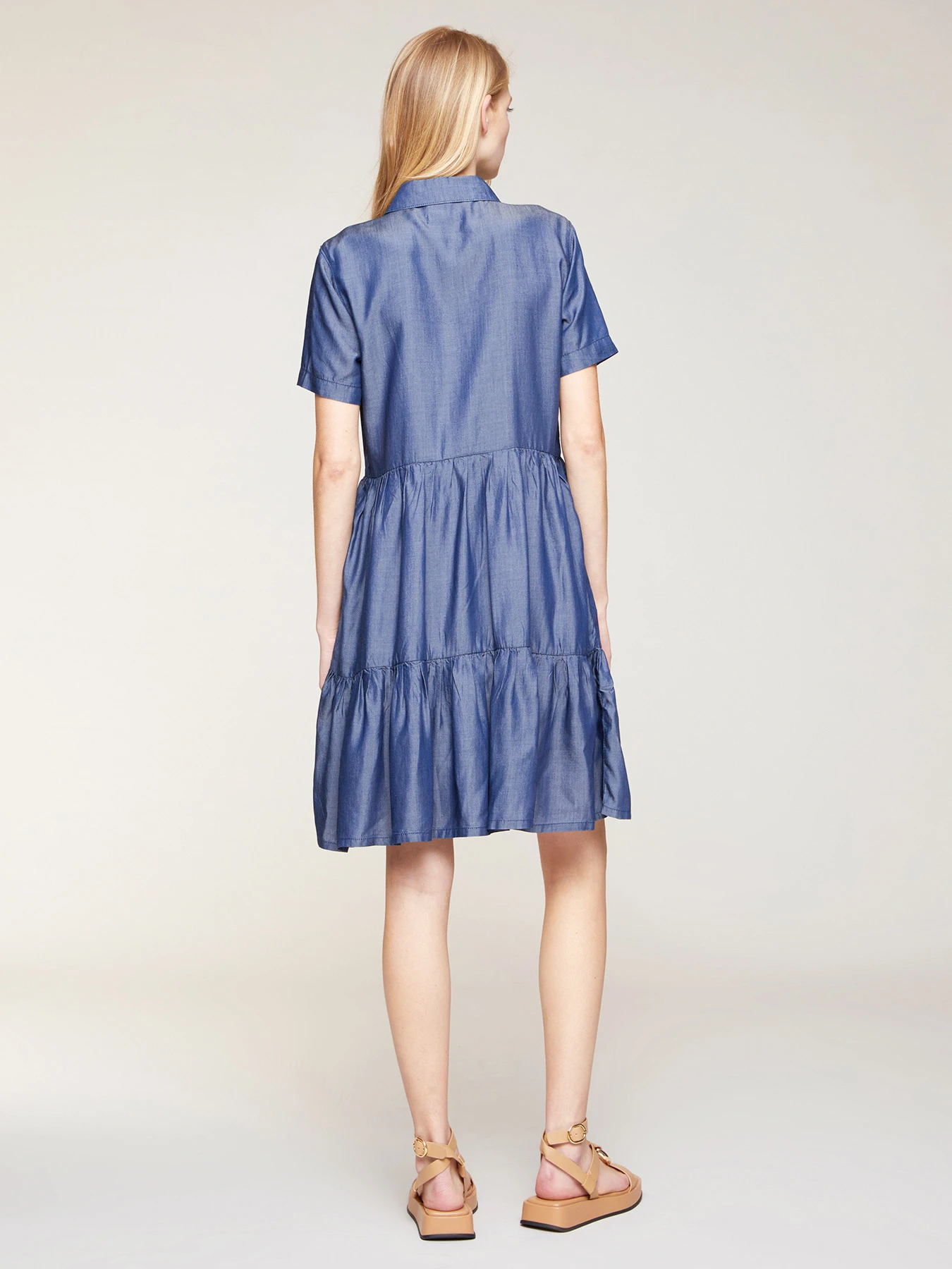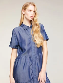 Vestito corto in TENCEL™; modello chemisier con colletto a vela e abbottonatura all’inglese; maniche corte, gonna svasata con balze.; Le fibre di lyocell e modal a marchio TENCEL™ sono prodotte mediante processi ecologicamente responsabili dal legno, materia prima naturale proveniente da fonti sostenibili.