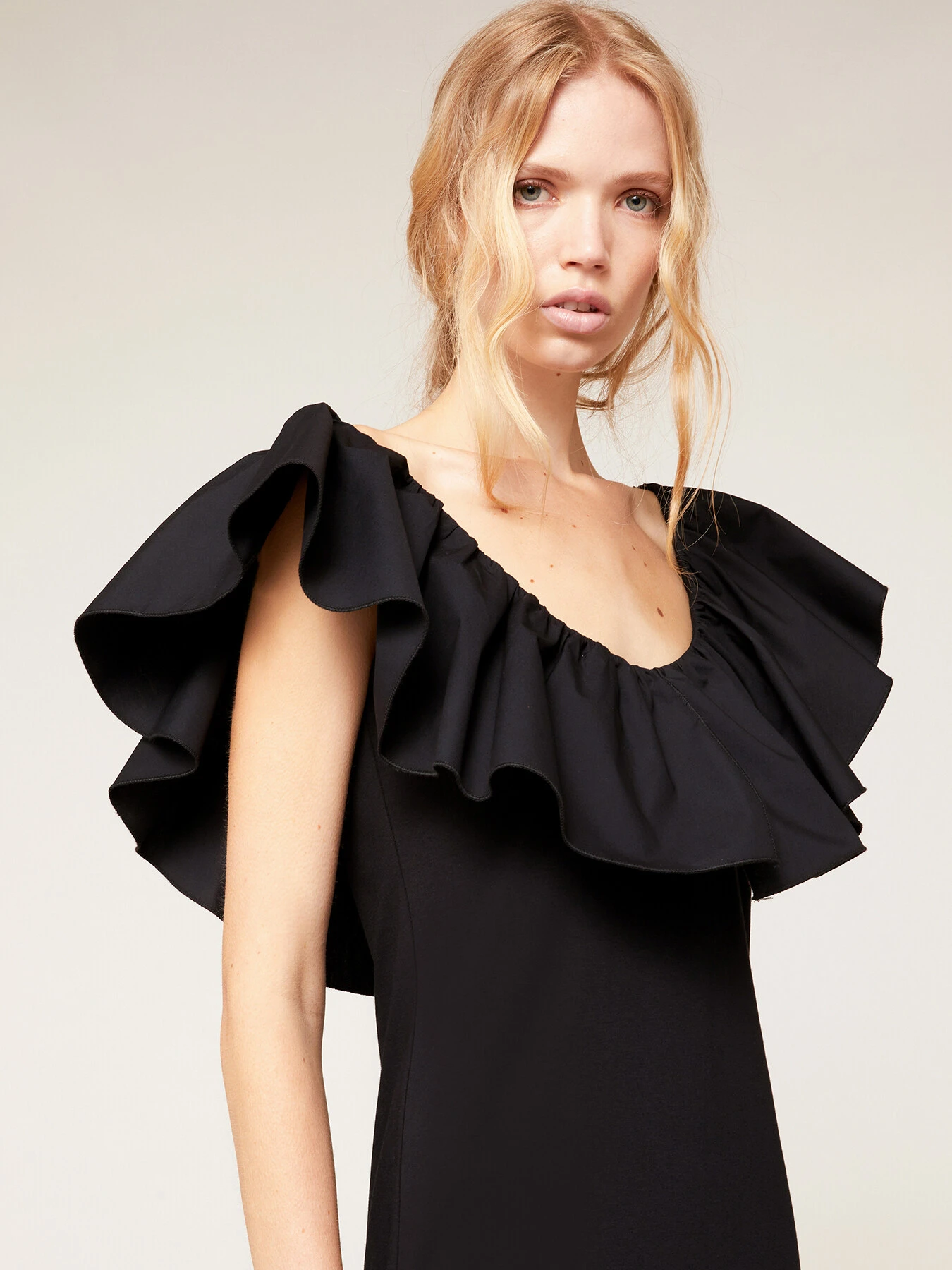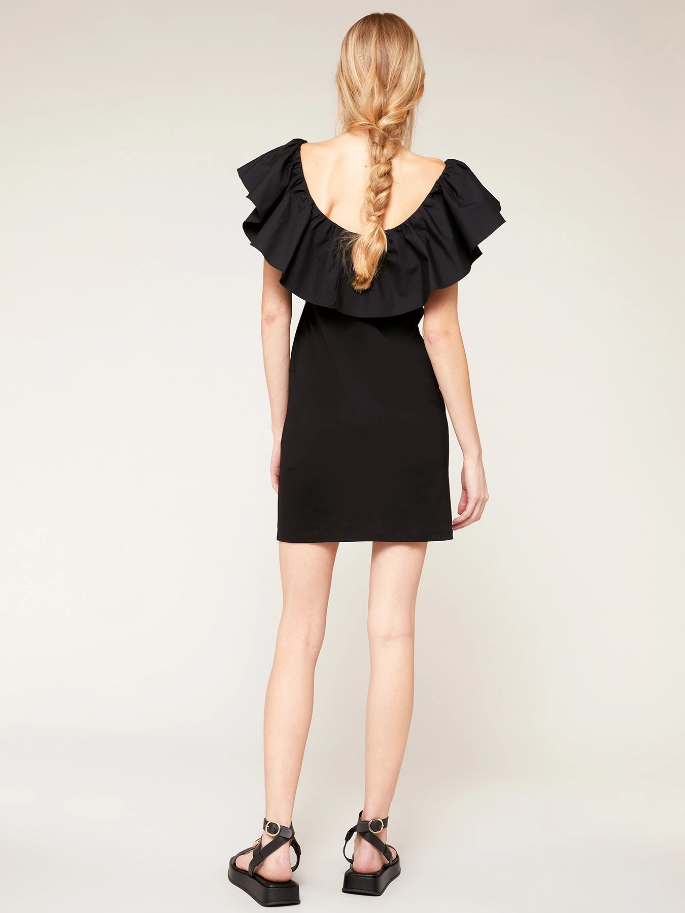 Vestito corto in jersey di cotone tinta unita; scollo off-shoulders con elastico interno e maxi volant; linea diritta.