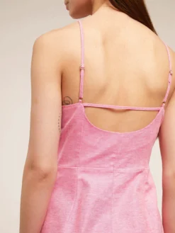 Vestito estivo a tubino in tela di lino misto cotone; scollo all’americana con spalline fini regolabili; chiusura con zip invisibile sul fianco, piccolo spacchetto frontale.