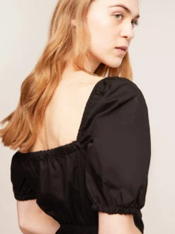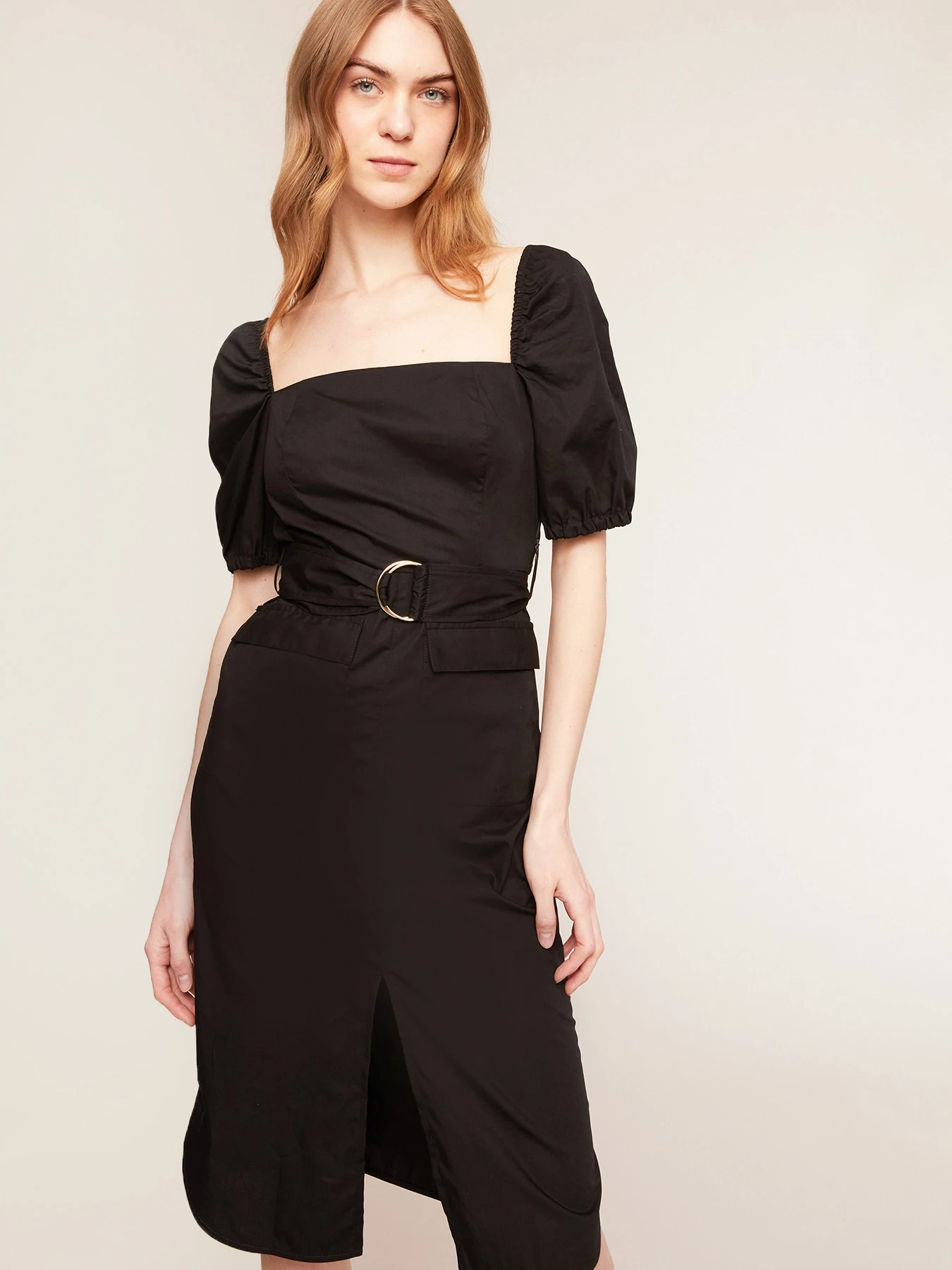 Vestito estivo in popeline di cotone tinta unita; scollo quadrato, maniche corte a sbuffo con motivo elastico al fondo; cintura in vita tono su tono con fibbia metallica, apertura laterale con zip; tasche frontali applicate, fondo con spacco centrale e bordi arrotondati.