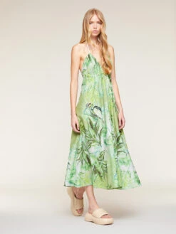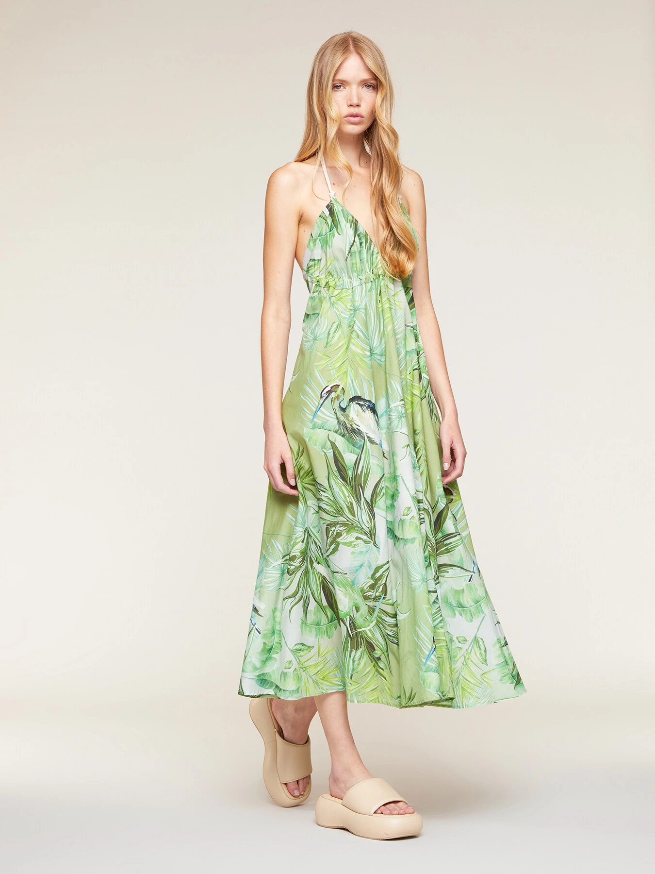 Vestito estivo fantasia foliage in mussola di cotone con fodera interna; corpino con taglio stile impero scollato a v e nastri in corda da annodare dietro al collo; schiena scoperta, gonna lunga con maxi svasatura.