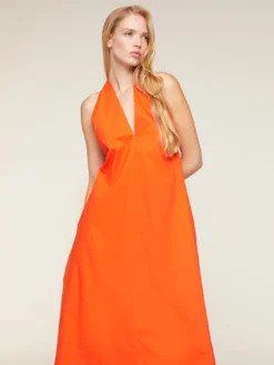 Vestito estivo lungo in popeline di cotone tinta unita; linea svasata con scollo halter e schiena scoperta; chiusura con zip nel centro dietro, tasche verticali inserite nel fianco.