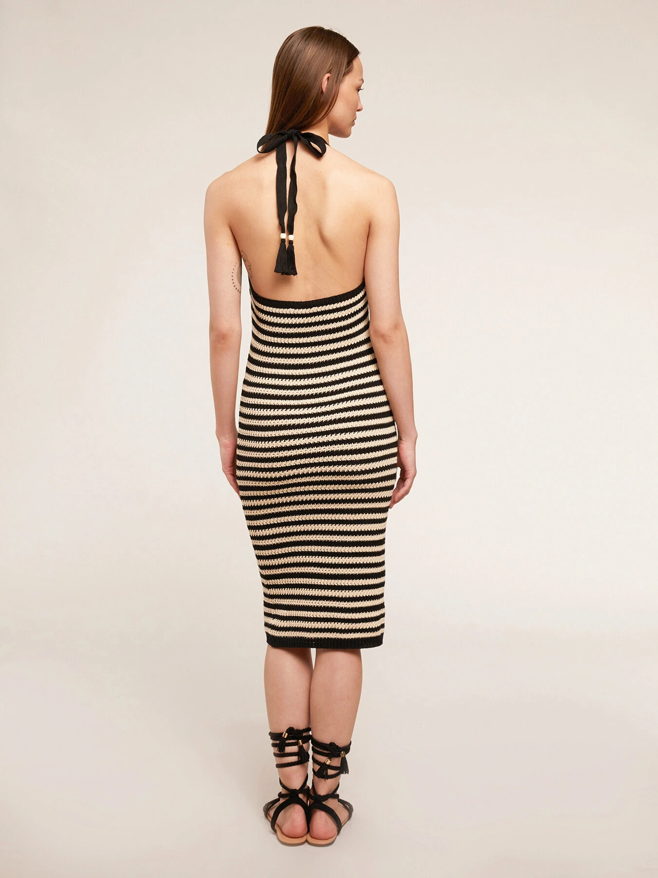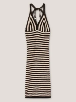 Vestito in maglia effetto crochet 100% cotone a righe bicolor; scollo con coppe sagomate e lacci da annodare dietro a collo; lunghezza midi, vestibilità slim.